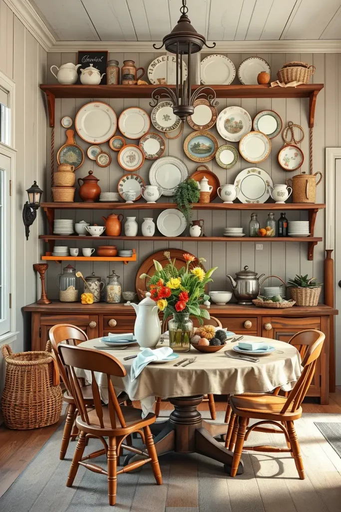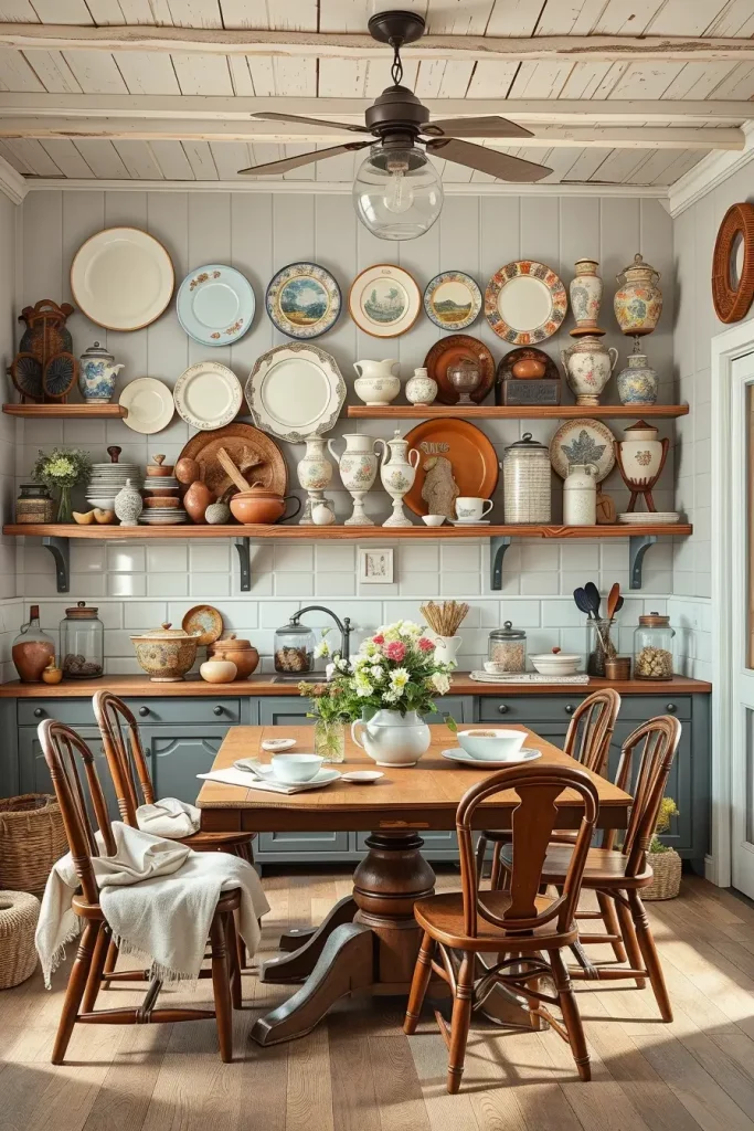 Hanging decorative plates and collectibles is a great idea to make a farm cottage personal. I prefer to hang hand painted ceramics, pottery or vintage items on plate racks or open shelving attached to the wall. These objects do not only narrate a story but also introduce the feeling of history and craft to the room.