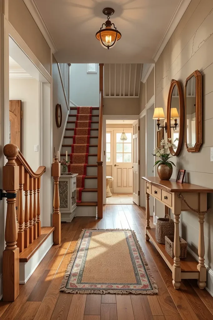 Farm cottages frequently have hallways and stairs that determine the atmosphere of the rest of the house. I like to make them simple wooden railings, painted stair risers, and natural runners. Such information will make even transitional spaces warm like the cottage.
