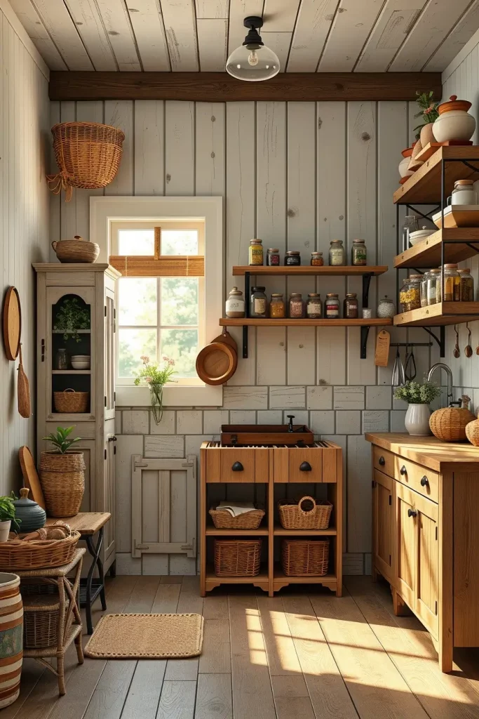 Smart storage that does not seem to be an afterthought is one of the most useful features of the farm cottage aesthetic. My recommendation would always be built-in shelving that has a distressed wood finish or open cabinets with wire baskets as it makes the room look real and keeps the necessities in a neat place. These solutions will enable you to be organized without losing the rustic nature of a cottage home.