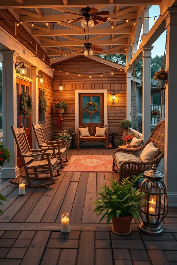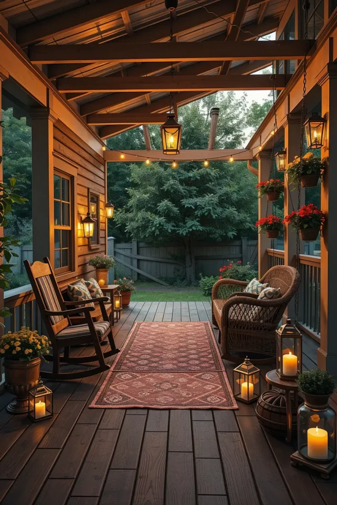 In the case of furniture, I tend to put a combination of rocking chairs, wicker chairs and a small side table to place drinks or books. An outdoor rug will make the area softer, and lanterns or string lights will create the atmosphere in the evening. A swing bench would also be a great addition- it immediately adds charm and nostalgia. I usually finish off the look with potted plants or herbs which provide greenery but do not feel too formal.