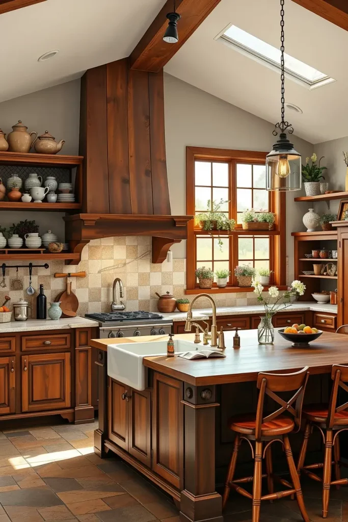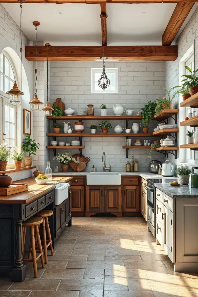 It is characterized by farmhouse sinks, big wooden islands, and open shelving. I would prefer to have vintage-looking faucets, wooden bar stools, and soft pendant lights to find the balance between functionality and beauty. Authenticity is also underlined by natural stone or wood countertops.