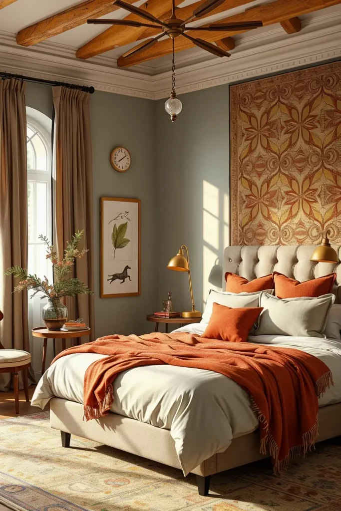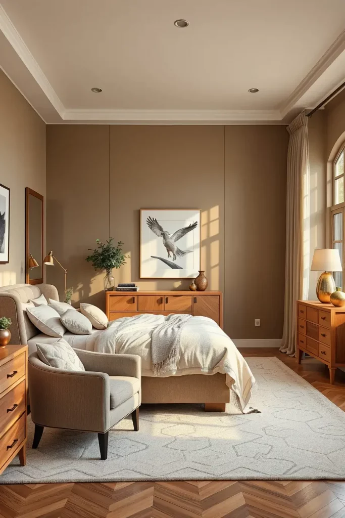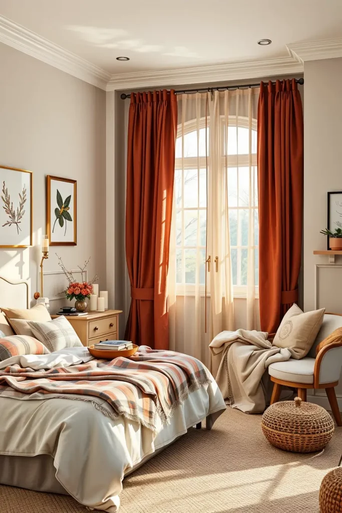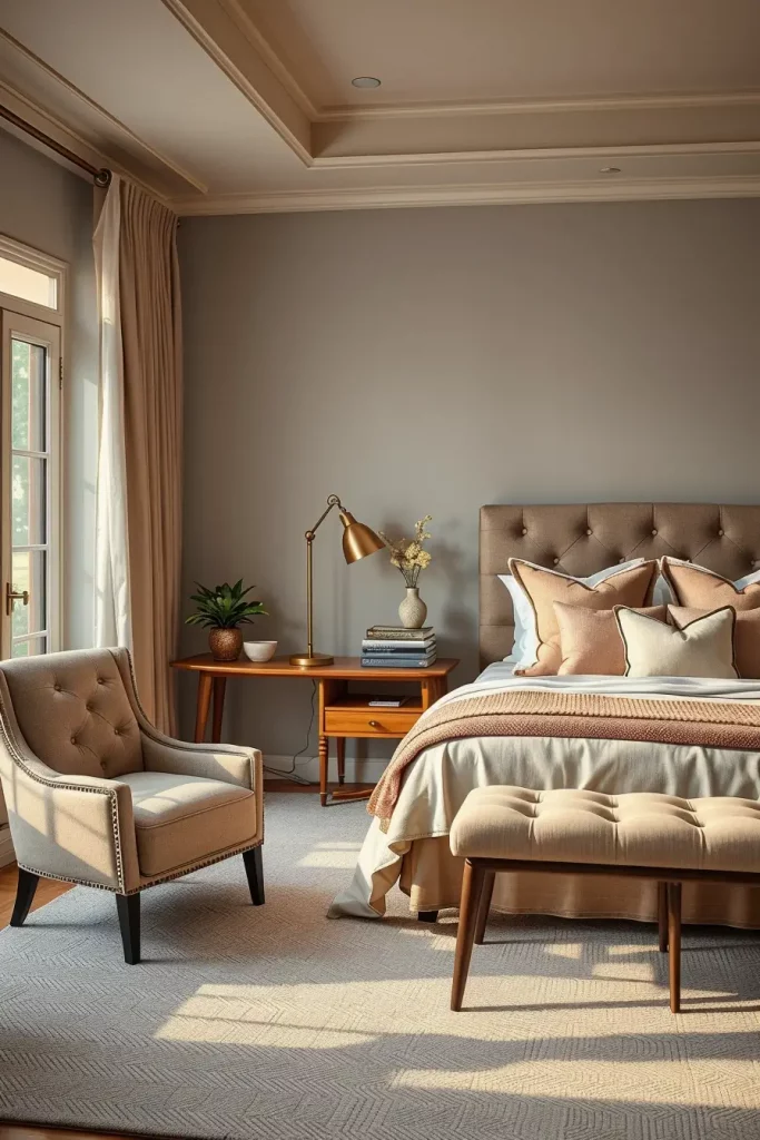 Regarding furniture, I choose neutral-colored items and add an element of color with bedding, pillows, or wall decoration. As an illustration, a bed frame in a beige color would be well matched with rust-colored throws and sage cushions. Neutral curtains are used to neutralize natural light and strengthen the palette.