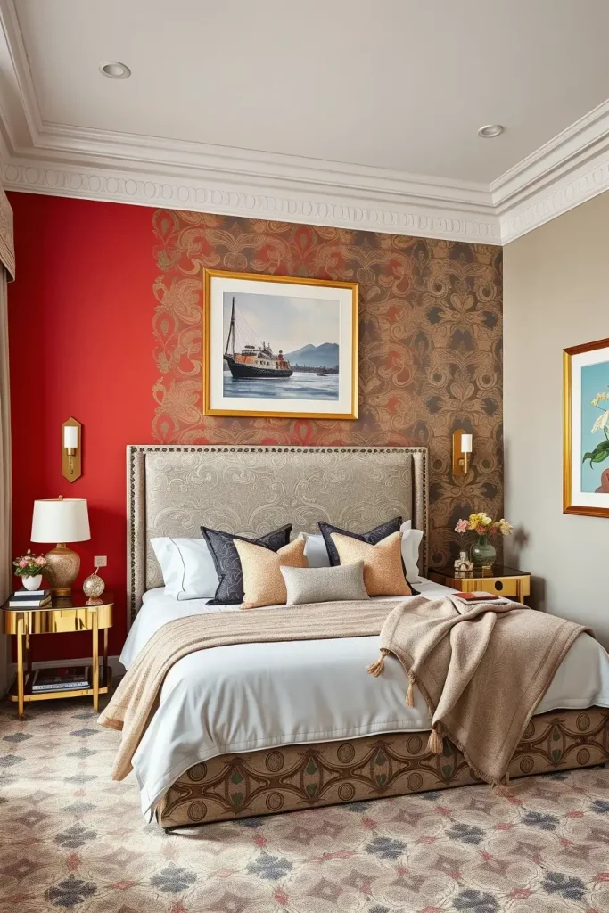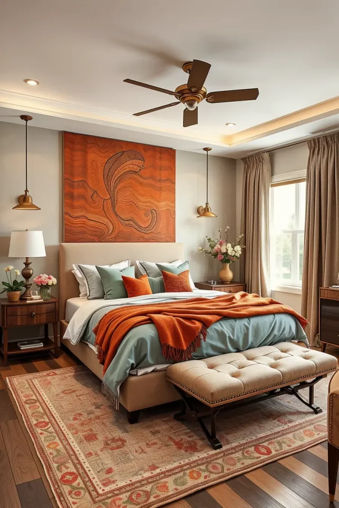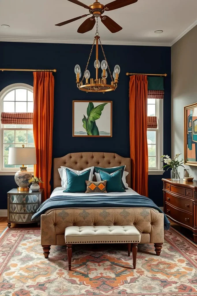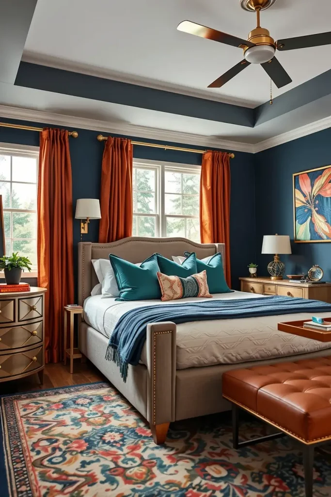 When I am designing with bold colors, I tend to apply them on accent walls, bedding or upholstered furniture. The focal points can be a navy headboard, emerald green throw pillows or rust-colored curtains. To make the appearance balanced, I add lighter-coloured furniture or accessories to make the room not heavy.