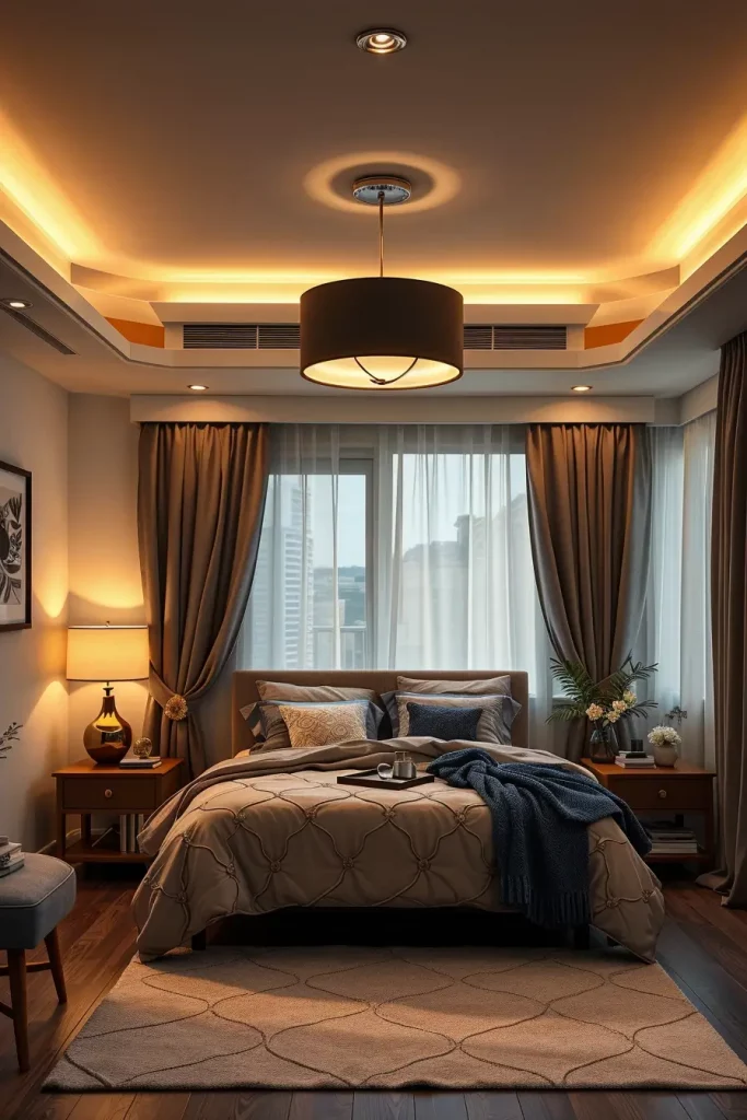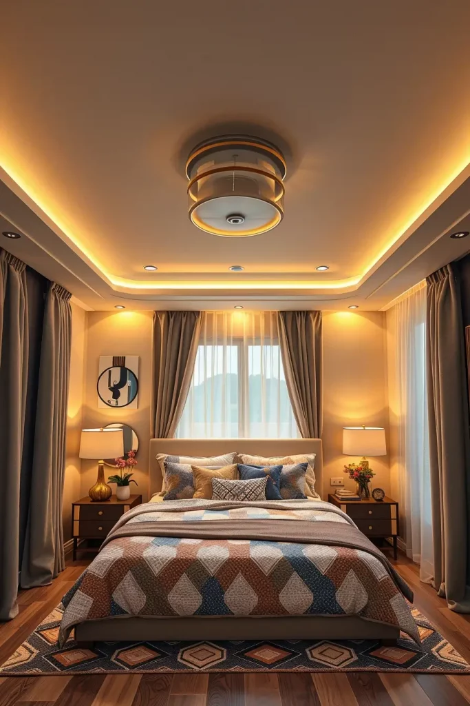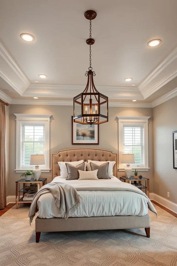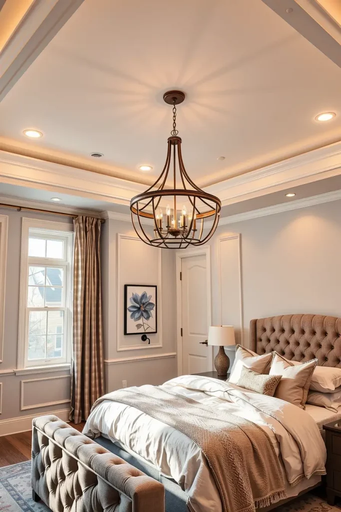 I tend to consider lighting when I am designing a ceiling. Flush lights offer a diffused light, and a contemporary chandelier or pendant lamp over the bed is an accent. Muted tones or soft neutrals painted on the ceiling make it deep without overwhelming the room. Crown moulding or trim is added to add sophistication and to connect the room to the walls.