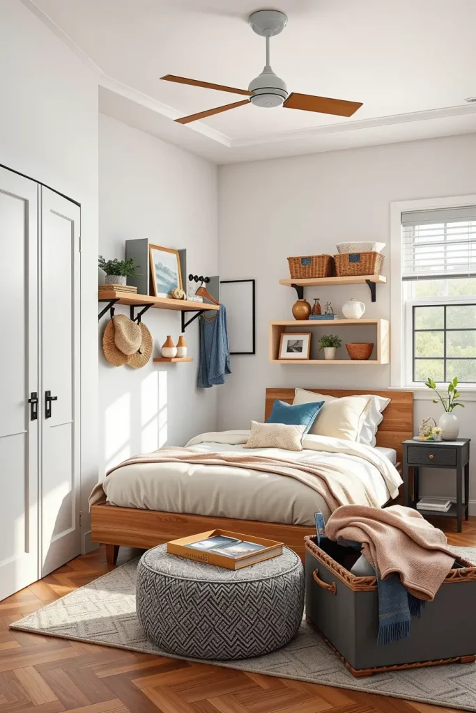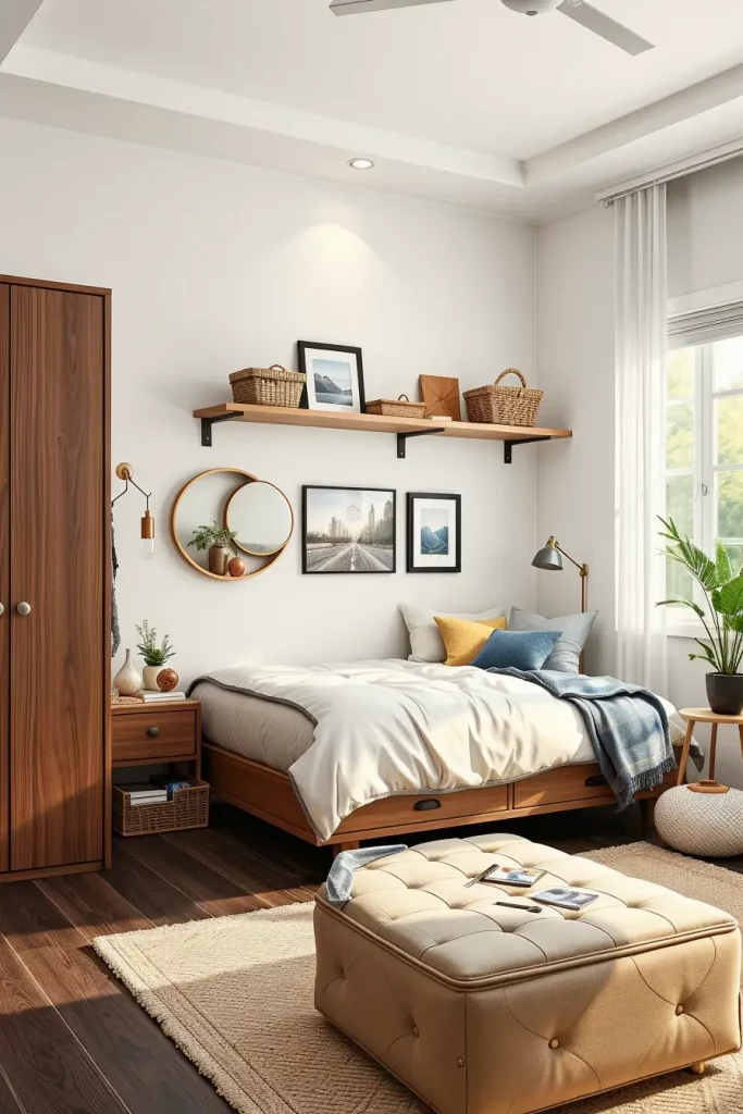 In the case of furniture, I tend to choose beds with storage compartments, wall mounted shelf units, and ottomans which can also be used as storage boxes. Small rooms can be fitted with a slim wardrobe that has sliding doors. I also prefer placing baskets and decorative boxes on open shelves in order to make the design clean and stylish.