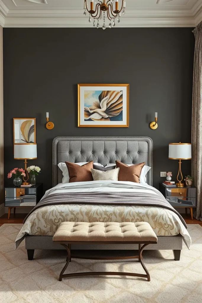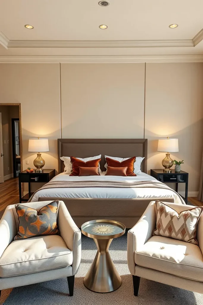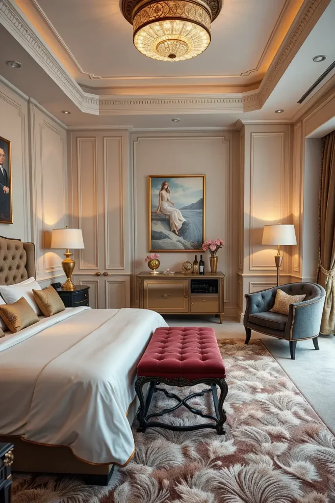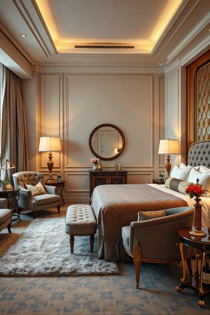 In the case of furniture, I will always suggest a king-size bed with a tufted headboard, a corresponding nightstand, and a bench at the end of the bed. The luxurious atmosphere can be further promoted by including such details as velvet armchairs, huge mirrors, and a minibar or coffee station. Lamps and hardware are finished in gold or brass to provide a minor touch of glamour.