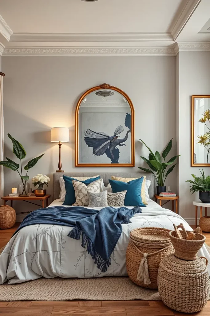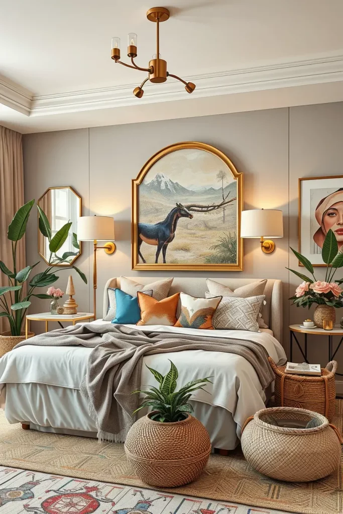 Some of my favorite pieces of furniture are big framed paintings, ornamental pillows, and smooth bedside lamps. The room is also made alive through natural objects such as plants or vases that have fresh flowers. Even small things like ceramic trays on nightstands or woven baskets are both stylish and useful.