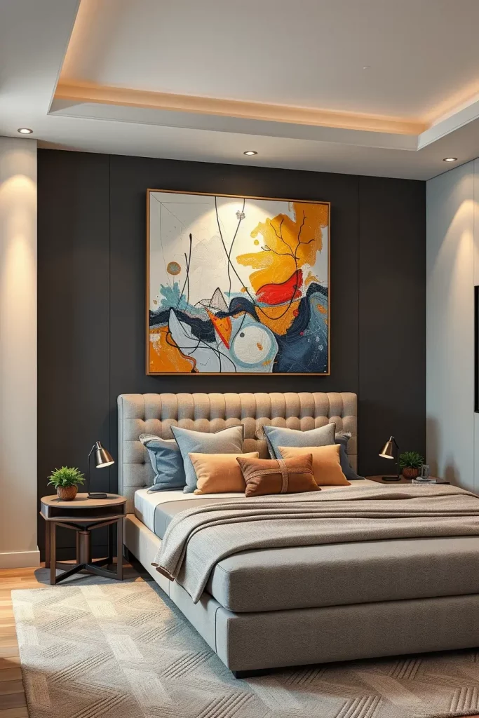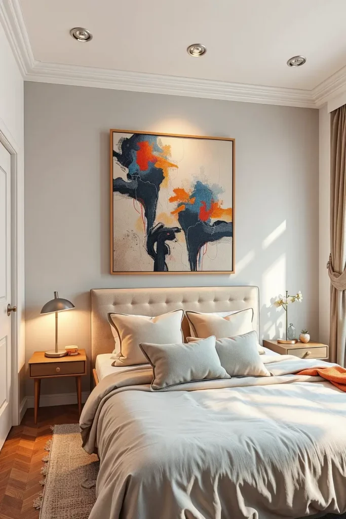 In designing around artwork, I tend to choose complementary pieces of furniture such as a neutral upholstered bed or a smooth side table that does not stand out of the images. The use of accessories like accent pillows and throws in the colors of the artwork provides harmony to the room and makes it cohesive. A wall sconce or a directional spotlight is a good example of lighting that can highlight the art piece and make it shine beautifully.