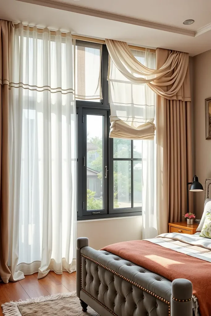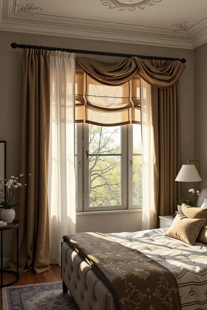 I usually use floor length curtains made of a material that matches with the bedding. The design may include Roman shades or roller blinds as an extra covering to make it more practical. The matte black or brushed brass rods used as hardware are a fine finishing touch.