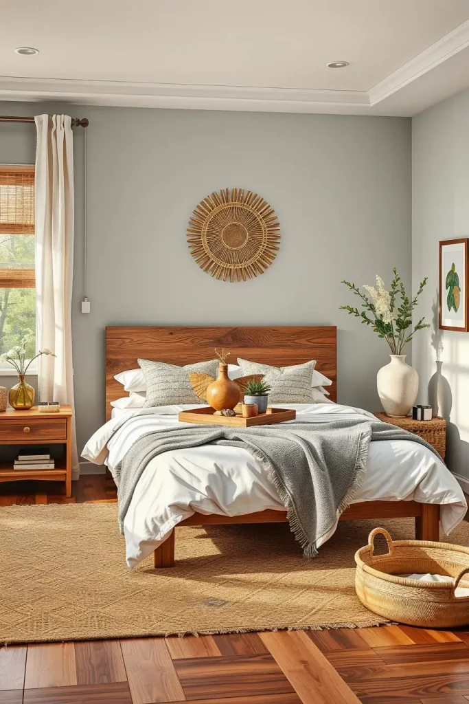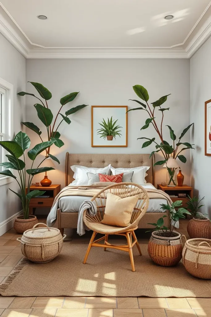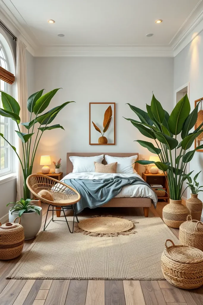 In the design of such a room, I would incorporate potted plants such as fiddle leaf figs or snake plants, which would be coupled with rattan chairs and wooden bedside tables. Natural linen duvet and cotton throw blankets are used to add to the breathable and welcoming nature of the room. I would also suggest woven baskets to store and sisal or jute rug on the floor to add warmth. These pieces combined make up a design that is comfortable and contemporary.