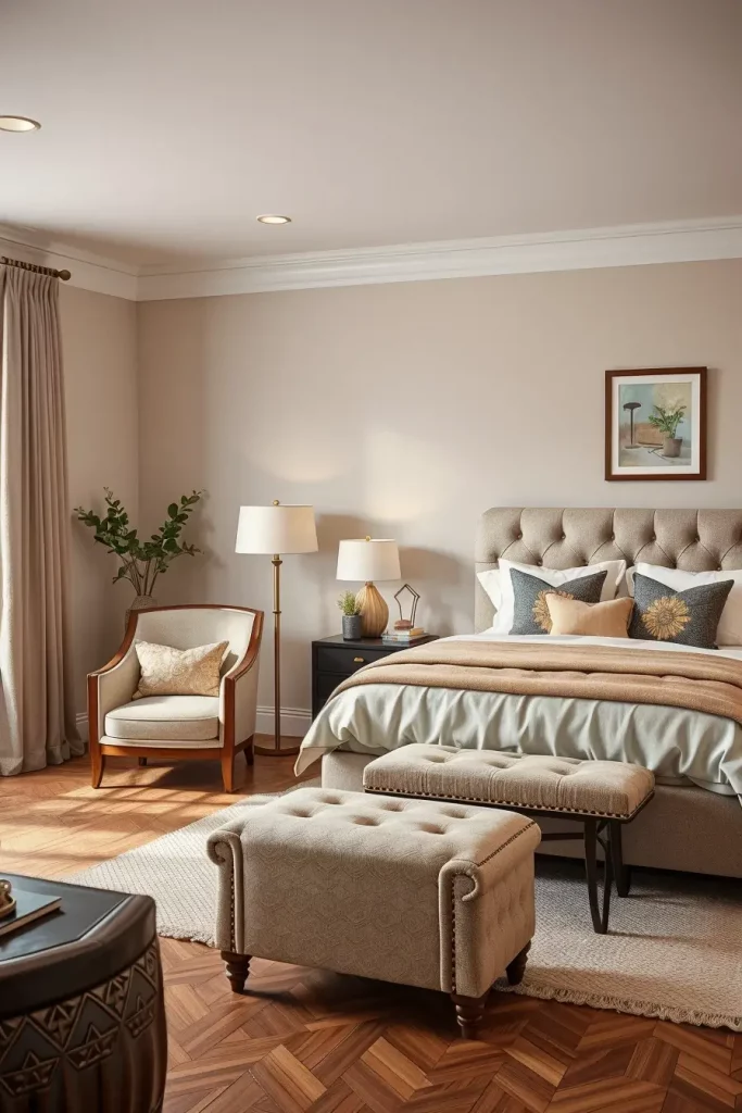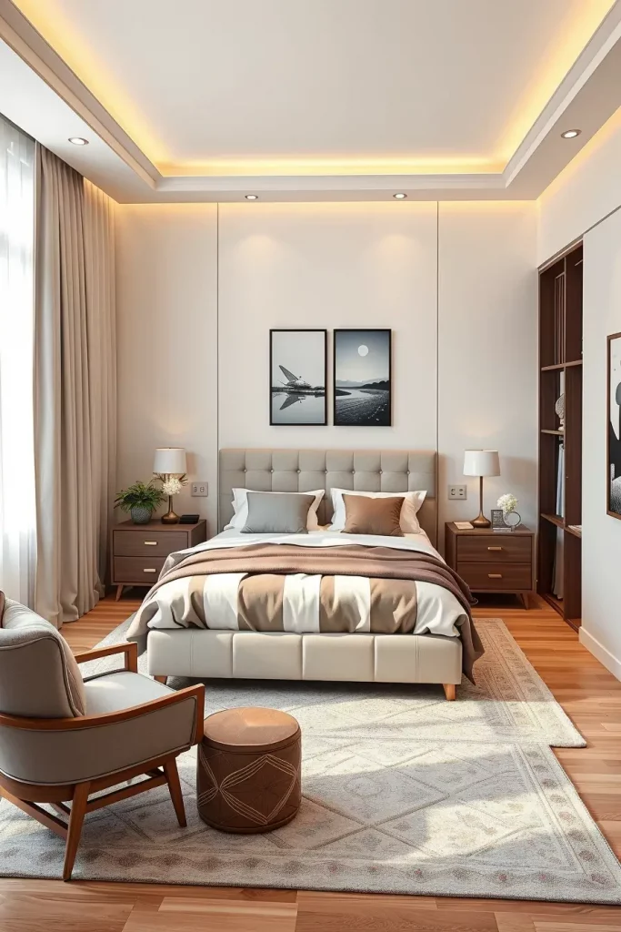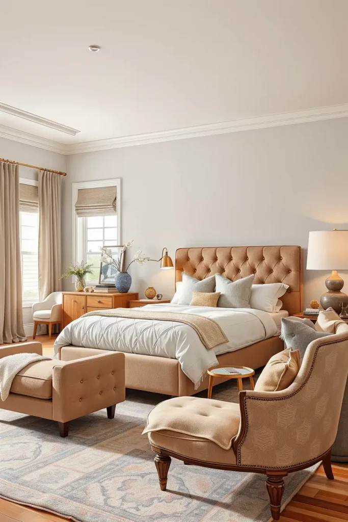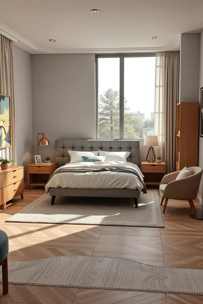 In furniture, I would be inclined towards upholstered beds in neutral fabrics, light wood dressers and linen bedding. The space will not be flat because of adding some layers of textures, like a wool throw or a boucle armchair. Bronze or matte black accents are made of metals to give a subtle contrast and refinement.