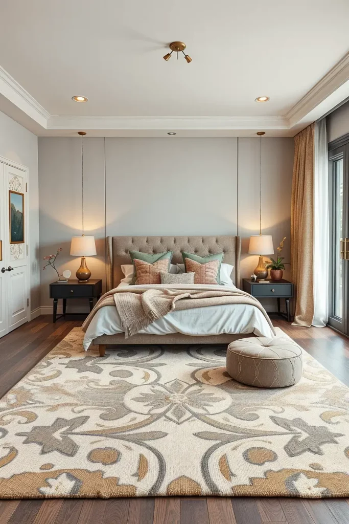 In the case of the rugs, I usually choose neutral colors or light designs that match with the bedding and curtains. An overbed rug will provide a balanced appearance whereas smaller rugs can be used in seating areas to make them more comfortable.