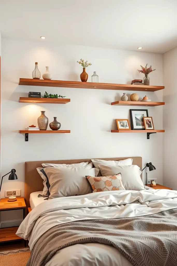When selecting shelving to be used in a guest room, I seek slim designs that do not take over. Small framed photos or ceramic vases with floating wooden shelves are a good combination. In other projects, I have incorporated in-built shelving around the bed framing it both with utility and aesthetic appeal. Adjustable shelves enable homeowners to adjust the display without any difficulty amongst visitors.