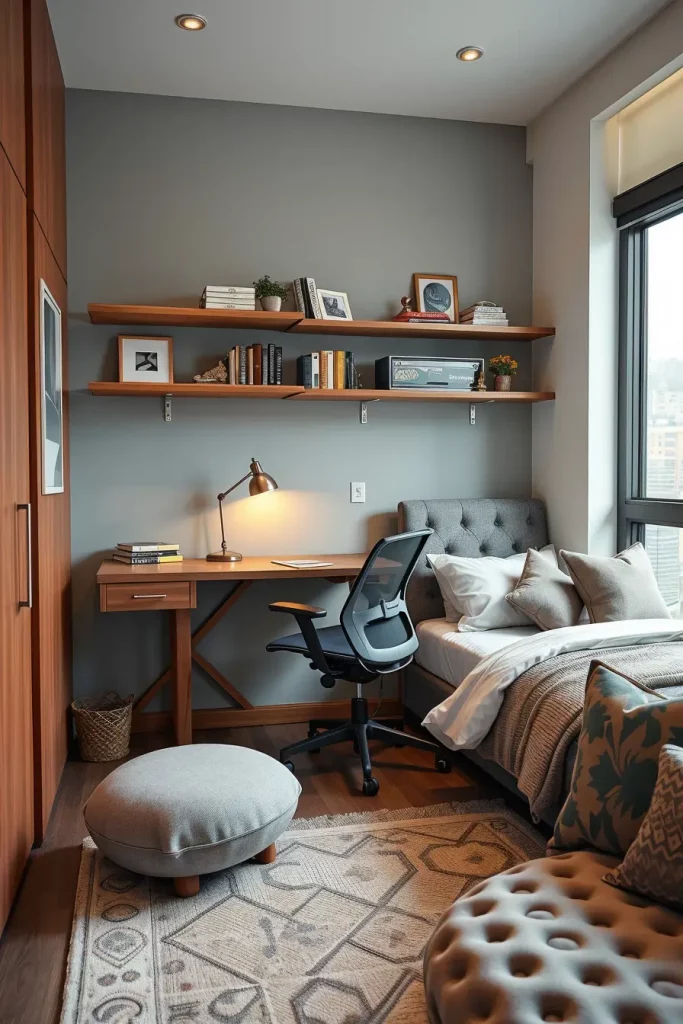 Going further to elaborate on this idea, I would offer to add wall-mounted book or decor shelves. It liberates the floor space and provides an additional personality to the retreat.