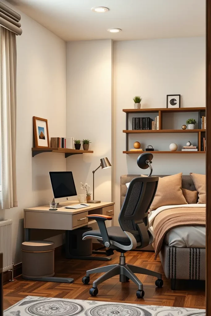 In this arrangement, I tend to include a small desk, an ergonomic chair and a thin lamp. Shelves mounted on the walls above the desk can be used to add additional storage without occupying the floor space. Single-color schemes make the corner serene and a plain corkboard or framed art is used to add some character without interfering with the productivity.