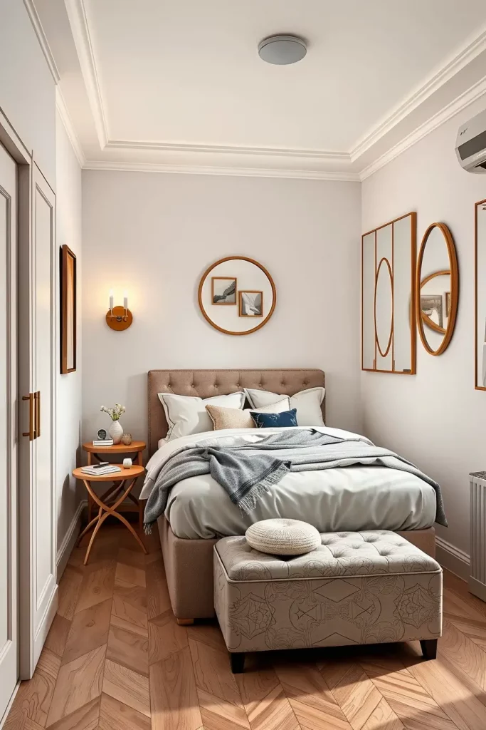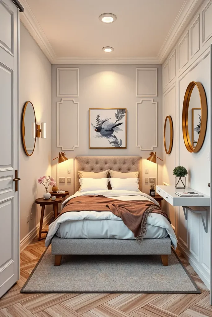 Storage beds, nesting side tables, and slim wardrobes are some of the practical furniture solutions. I also prefer using wall sconces over table lamps to create more space on the table. The mirrors opposite the windows are used to reflect light and make the room appear larger. A foldable desk may also be used as a guest vanity.