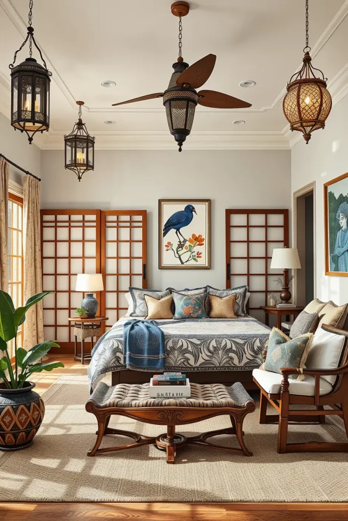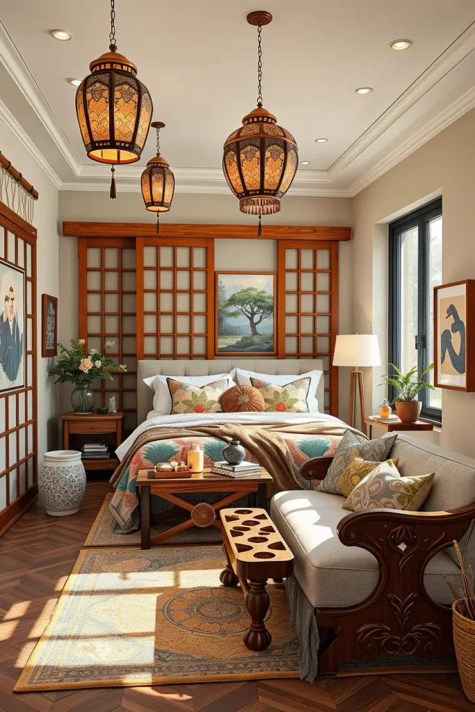 In this design, I prefer to use Moroccan lanterns, Indian block-printed bedding or Japanese-style shoji sliding doors. These touches, together with neutral walls and smooth modern furniture, create a balance between both unique style and comfort. The space is memorable and yet very real with a carved wooden bench at the foot of the bed or globally inspired wall art.