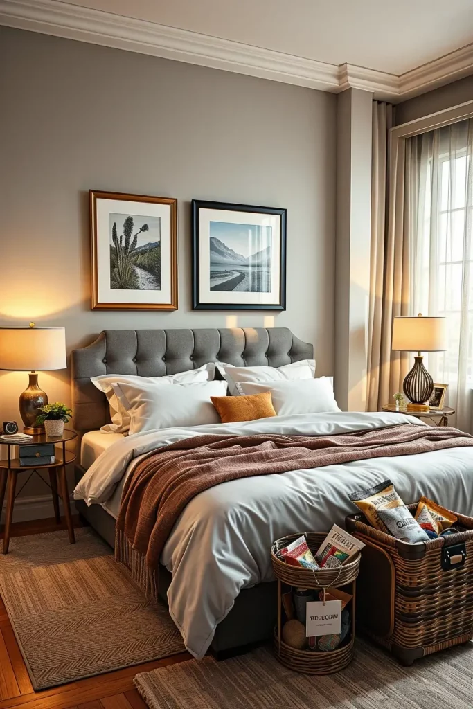 To do this, I typically provide high quality bedding, plush pillows, and layered throws to be comfortable. A small desk or vanity that has a chair serves as a workspace or makeup area and bedside lamps with warm lighting are convenient. The walls have framed artwork or personal photography that does not overpower the walls. It is better to add a luggage rack or a bench to allow guests to relax.