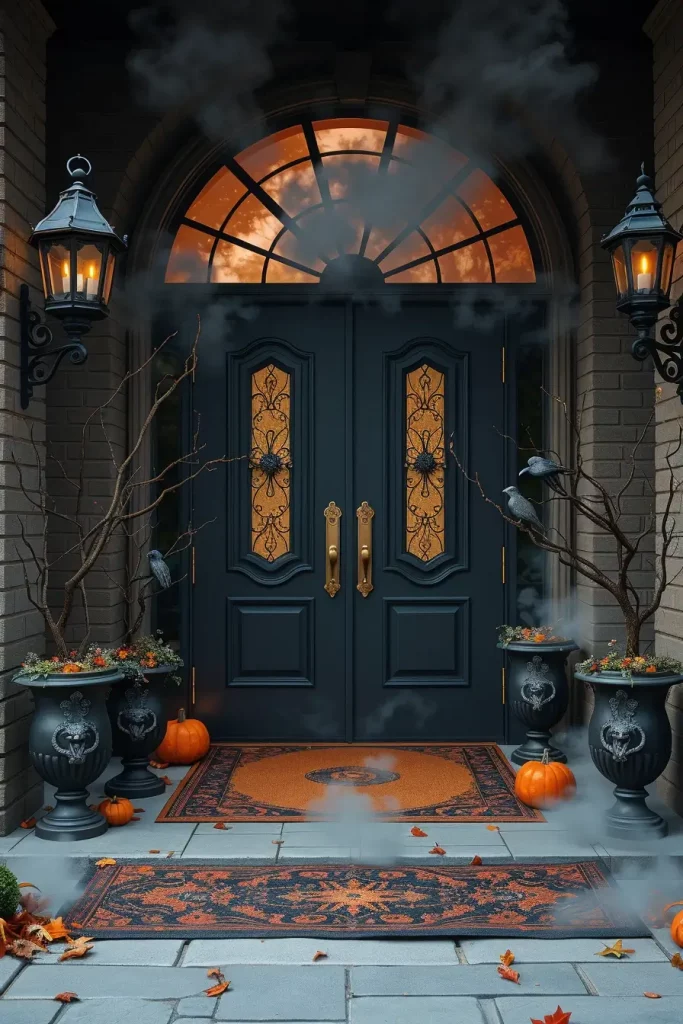 Speaking of the tone of your Halloween design, there is nothing better than a dramatic front door that will instantly attract attention. I would not think twice about suggesting a statement color such as matte black or deep charcoal as a starting point. In 2025, the most important trend is the sleek and eerie layers, such as tall, double doors with glowing fog, architectural framing that creates a haunted manor feel. It suits houses that have a wider front door or symmetrical fronts.