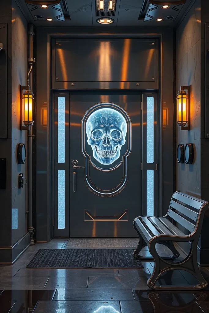 In one of the designs I was involved in, there was an inbuilt speaker system which whispered about ghost stories as the guests got near. The doorbell caused the release of fog and flickering flames in lanterns. The tech is in the forefront and it has a clean and minimalist design of the door in slate or matte black. Furniture remains understated—a single modern bench and a small metal console holding the system’s control hub.
