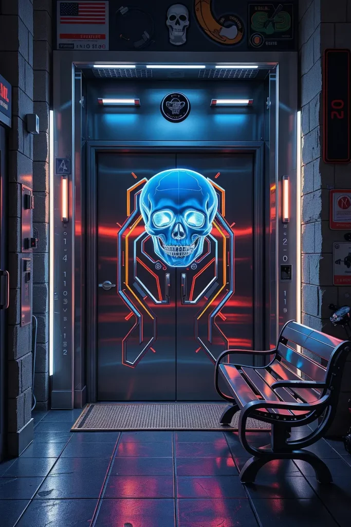 At a practical level, I have employed magnetic decor that is in the form of circuitry or heavenly symbols. Floating hologram skull or fog effect activated by motion brings things to a new level. In the case of furniture, simple benches of brushed aluminum and fiber mesh chairs combine harmoniously with the textures of metal.