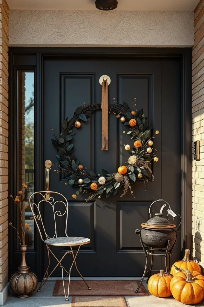 I would always advise that wreaths be mounted off-center to make them look more editorial. Put up a contemporary hook or brushed steel hanger and decorate the door with plain string lights or abstract bat stickers. Side table and a small bistro chair with one dark vase or ceramic cauldron is more than sufficient in the case of surrounding furniture.