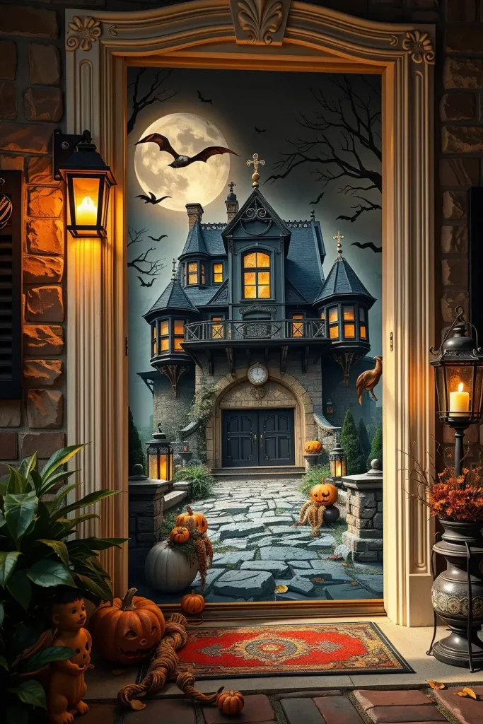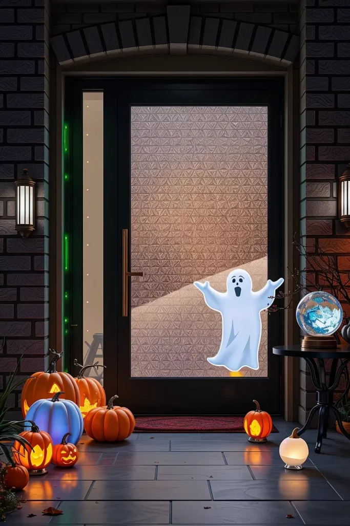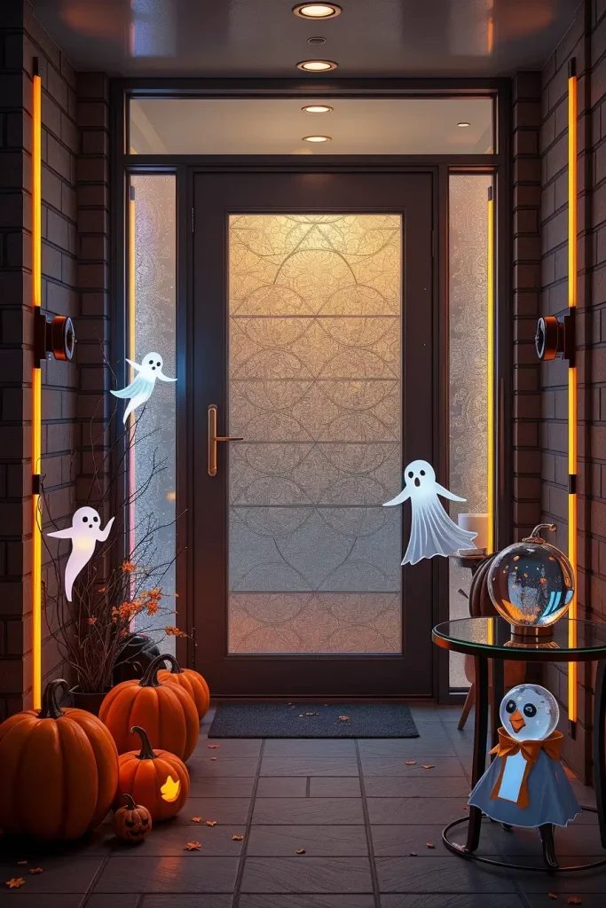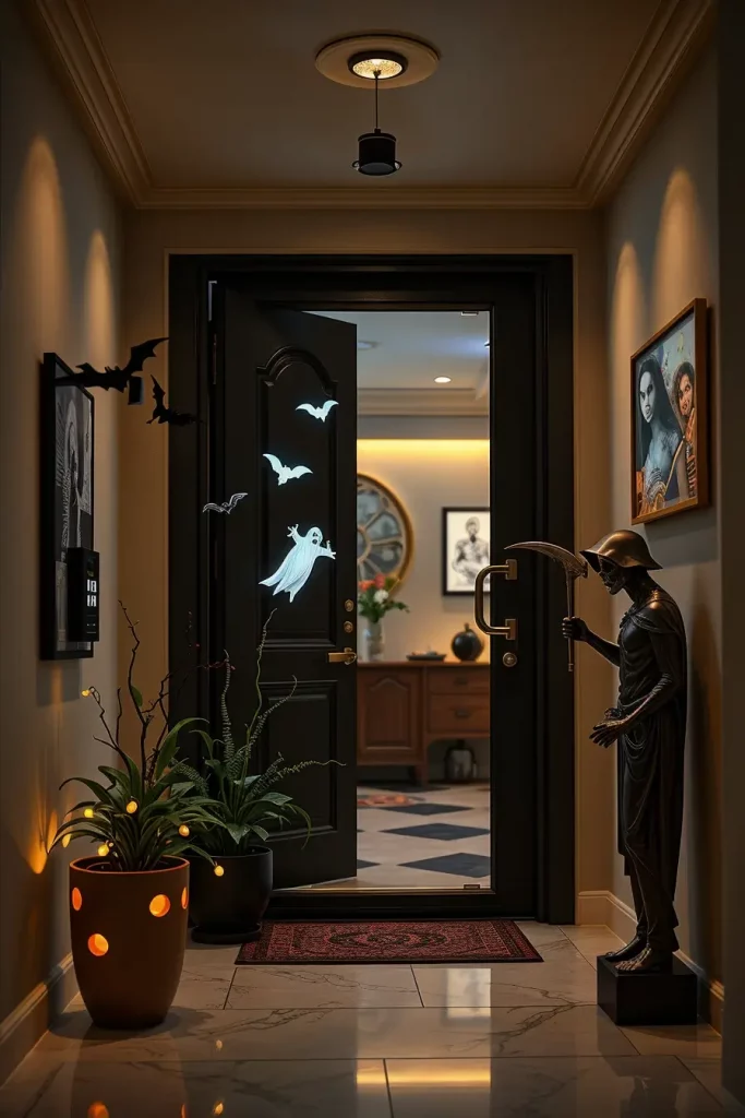 When I am working on these installations, I like to use color-shifting lights on low settings of purples, oranges, or even spectral greens. I usually combine the lighting with frosted glass doors or smooth paneling to reflect the light in a soft manner. I prefer to place acrylic pumpkins, translucent ghost cutouts, or even floating holographic items around the doorway. Furniture must be minimalist, maybe a slim side table with a glowing crystal ball or clever lanterns on the left and right.
