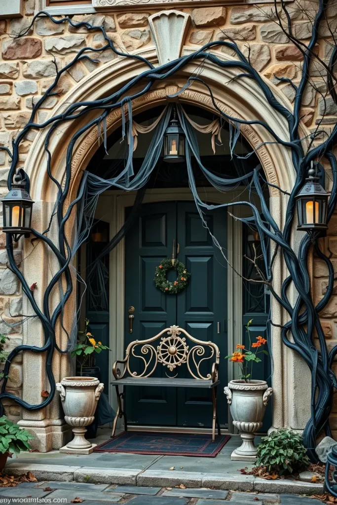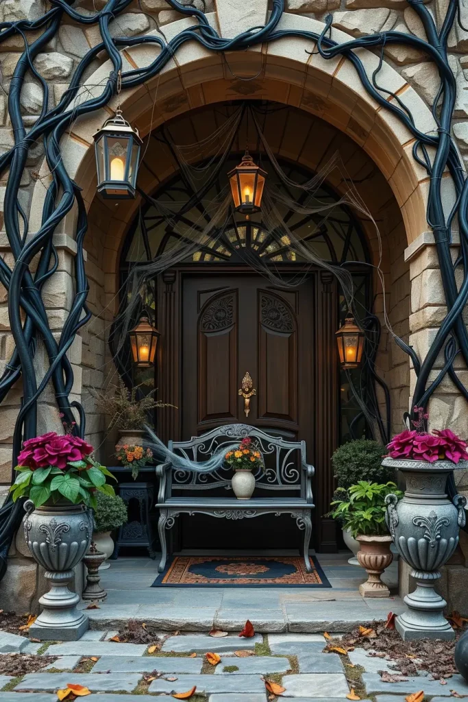 Provided you have an arch or transom in your front entrance, you are lucky, because these are the things that are designed to be decorated during Halloween. In 2025, we will have even more designs that emphasize the current architectural elements with organic, creepy decorations. I have myself dressed arches in off-balance garlands of twisted black vines, fake cobwebs, and hanging lanterns to make it feel immersive and storybook-horror.