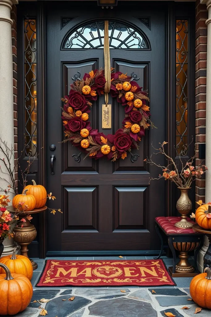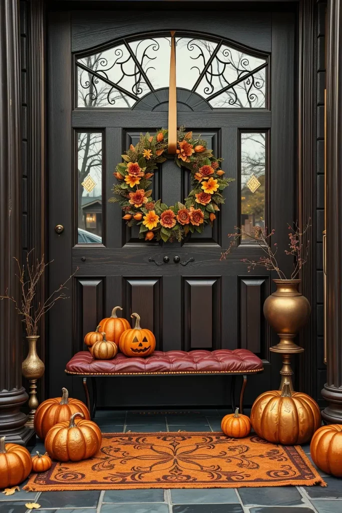 Halloween is a chance to embrace that inherent drama when it comes to homeowners with dark wooden doors or paneled facades. I will never stop saying that dark woods such as mahogany or walnut are moody by nature, so they are perfect to use in sophisticated Halloween decor. The entire design is deliberate and opulent with the appropriate accents.