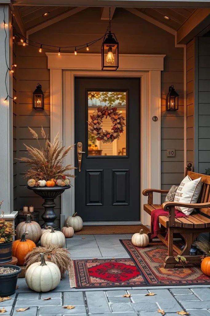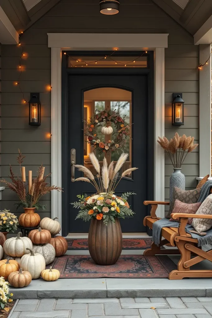 I suggest the porch to be framed by a minimalistic light strings of one color, most often, amber or white. For the door, a clean seasonal wreath paired with stacked pumpkins in non-traditional shades (white, slate, olive green) adds elegance. Furniture may consist of a low wooden bench and a big urn planter with sculptural dried flowers.