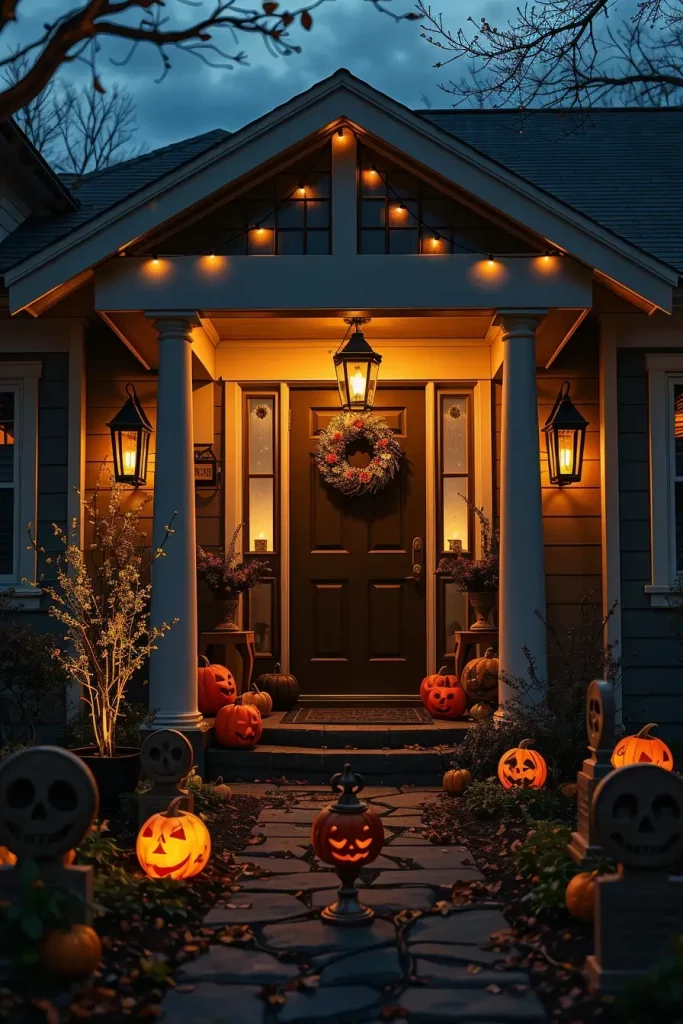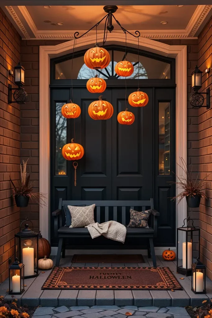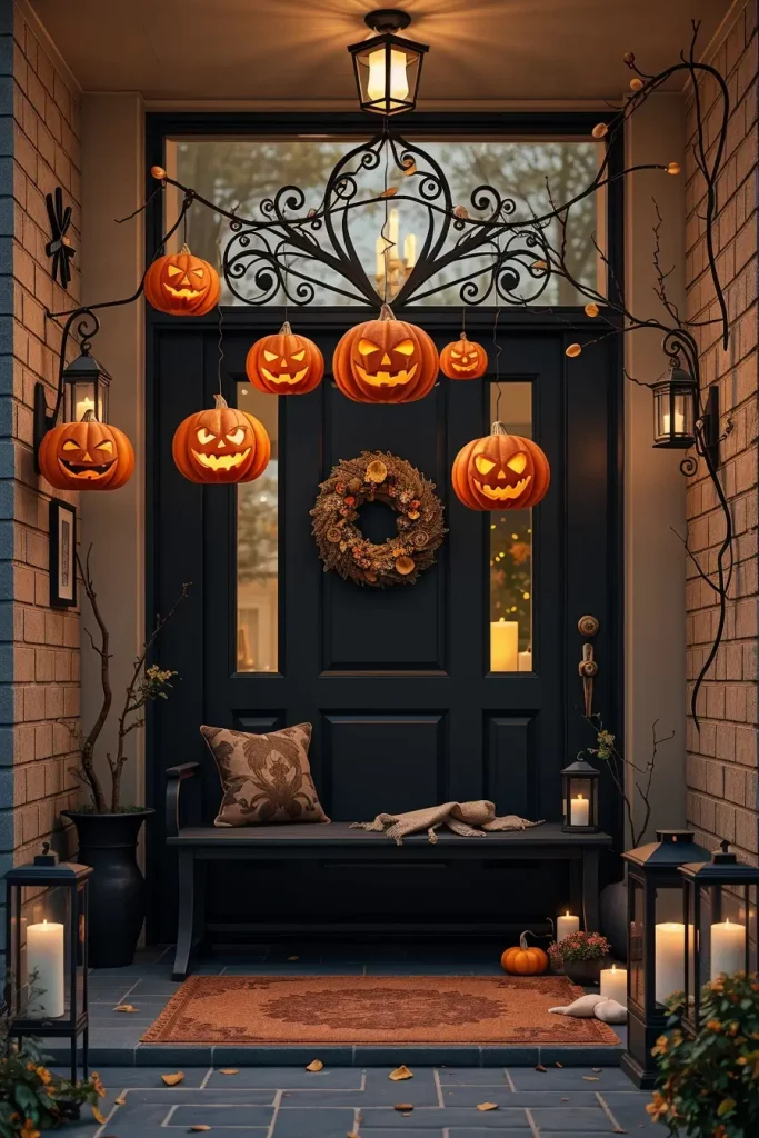 For minimal entryways that don’t allow for bulky decorations, a suspended jack-o’-lantern arrangement can create visual drama without clutter. I like to hang lightweight LED-lit pumpkins on clear fishing line at different heights in front of a flat wall or doorway. The effect creates the impression of floating faces when it is close to a white background or a glass panel. The concept can be used in modern door frames especially those with monochrome finishes or geometric decorations.