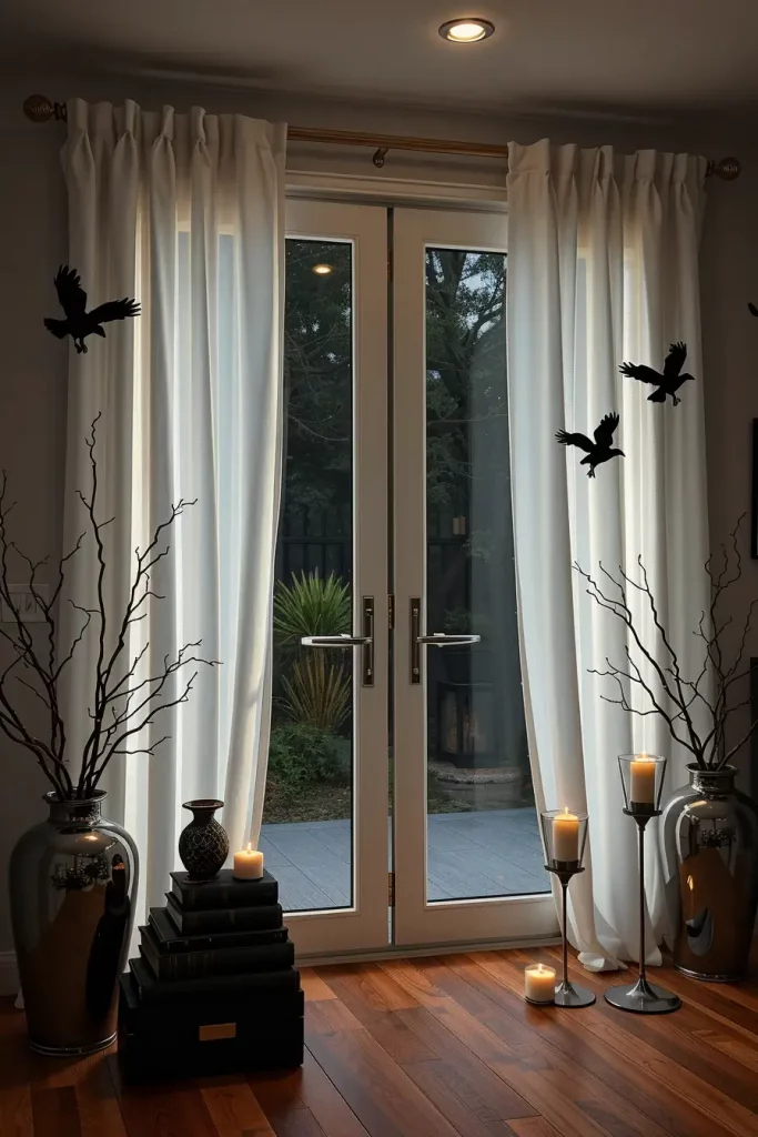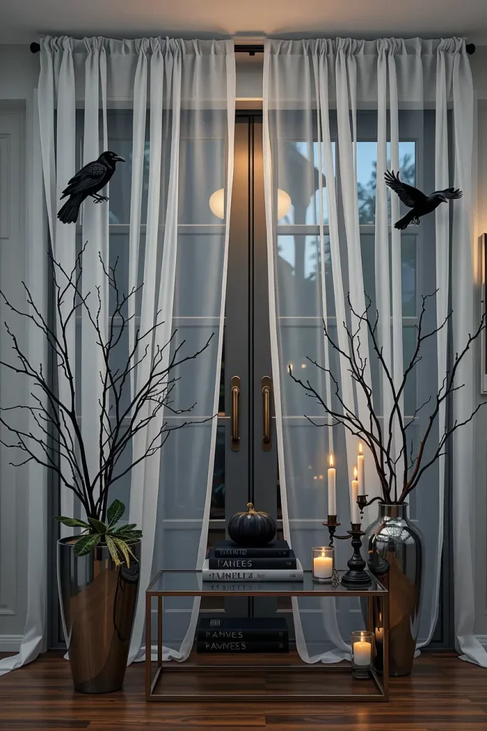 The effect of layering sheer white chiffon or gauze fabric gives a semi-translucent ghost effect. I stick the material over the door frame with adhesive hooks and leave the ends to hang on the floor. This is coupled with chrome planters with dried branches and black crows that bring in some form of structure. The scene is complemented by a minimalist console with candlelight or a pile of black books inside the doorway.