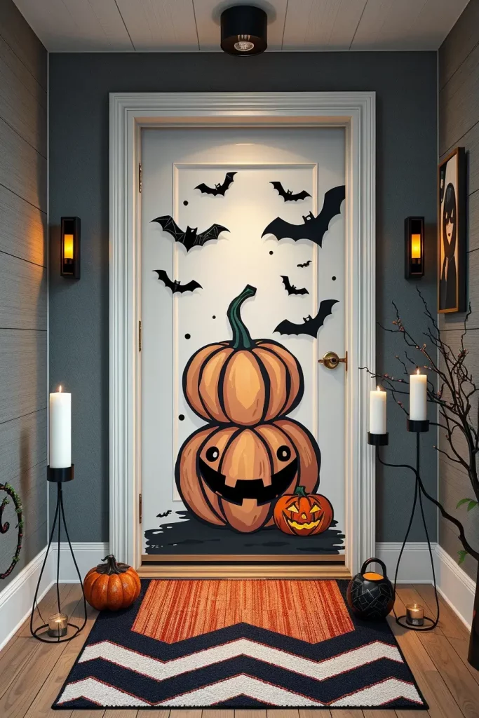 Halloween murals on the door are a great choice in homes that have large doors with smooth surfaces and can be painted or vinyl. In 2025, I turn to the silhouette of modern art, that is, cubist pumpkins, abstract bats, or fragmented skull silhouettes in black and gray colors. It is graphic, daring, and does not have that cheesy look of the usual Halloween decals.