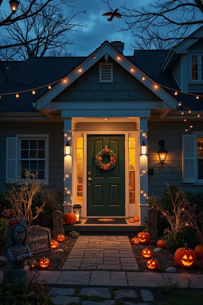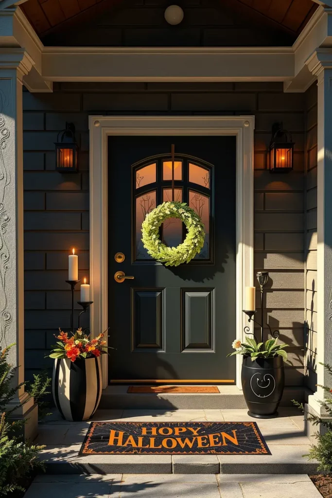 When your present front door is too simple to be festooned with Halloween, you can give it a modern makeover. I have assisted homeowners to redefine their door frames to use sleek moldings and intelligent paint colors. Slate gray or navy neutral or monochrome doors are easy to decorate with Halloween overlays. The contrast of the modern design with the minimum Halloween decoration is quite intriguing.