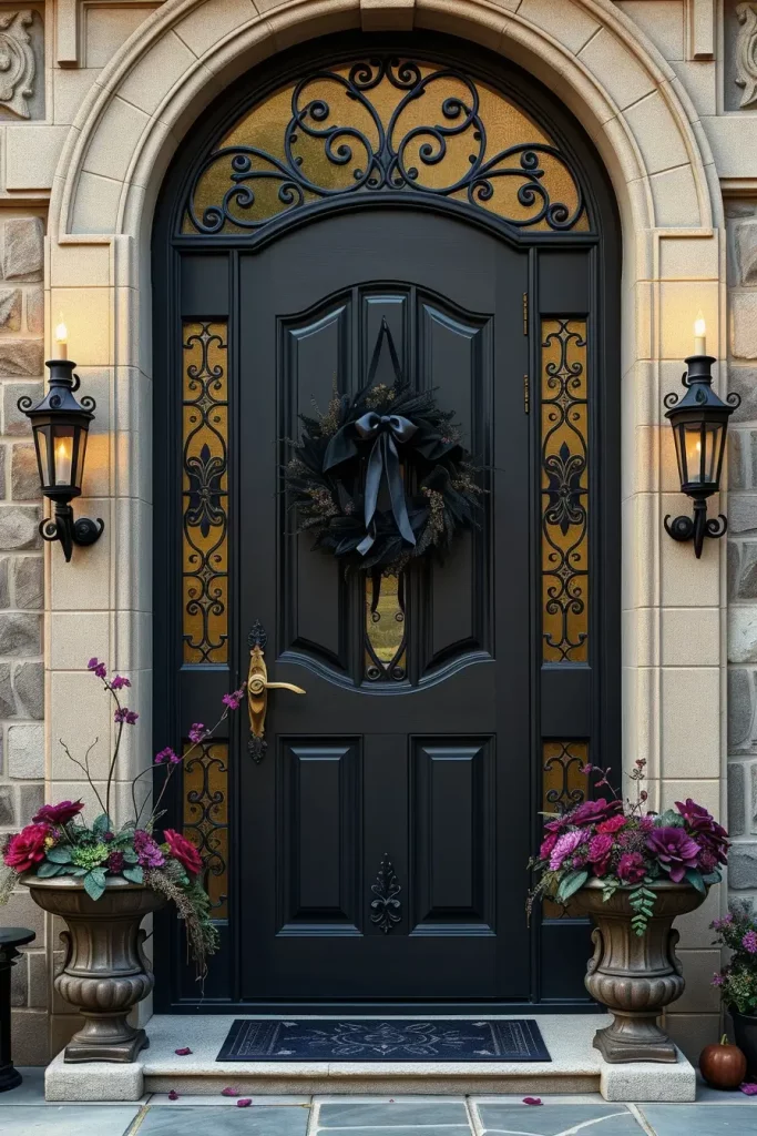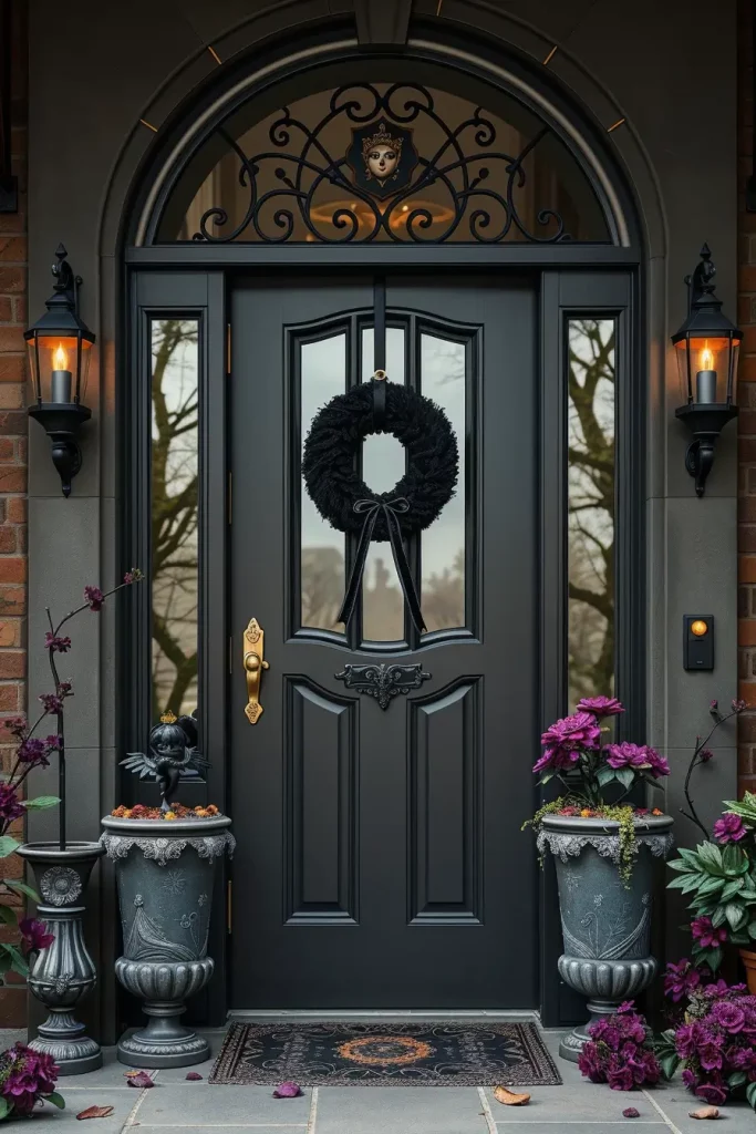 Black doors have been a Halloween staple, but in 2025, it is all about making them elegant with minor gothic touches. I tend to start with a matte or satin black base and add some depth using baroque style corbels or faux cast-iron appliques. It is a style that is perfect in both traditional and contemporary homes especially those that have neutral siding or lack of details.