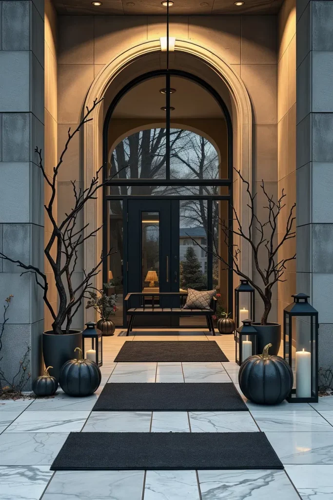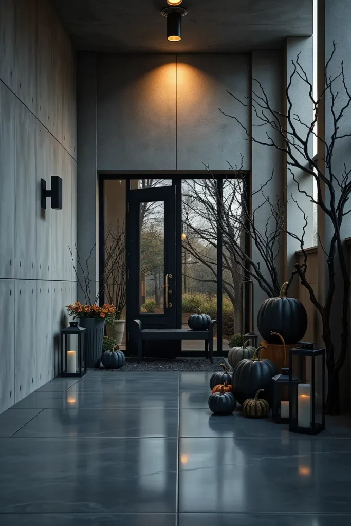 Polished concrete entrances provide an industrial blank slate that is ideal to use as a minimalist Halloween design. I am inclined to go stark here, black skeleton branches, single giant pumpkins in dark matte finishes, and narrow lanterns at the sides of the doorway. Concrete has a rough texture that works wonderfully with smooth or plush decorative elements.