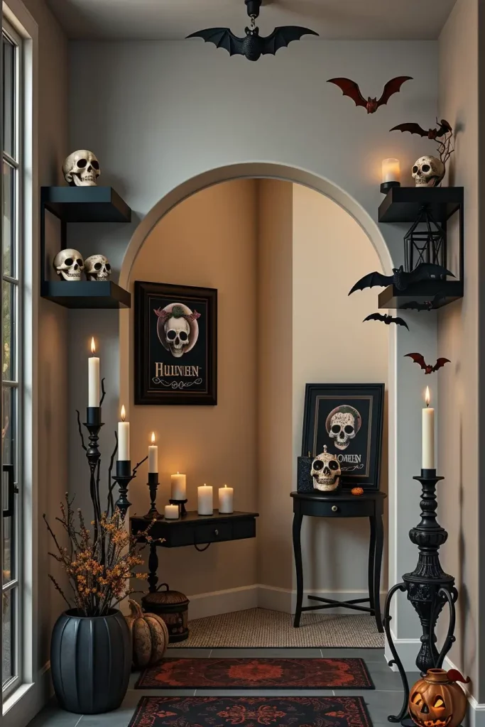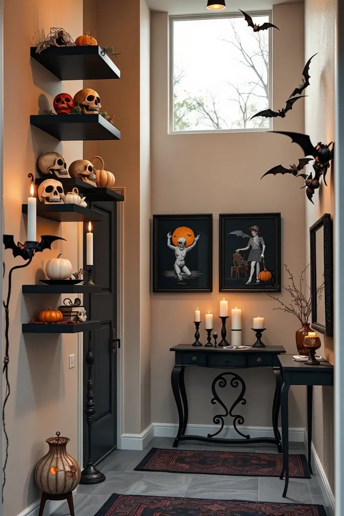 Every shelf is a scene: I usually have ceramic skulls, battery-powered taper candles, little shadow boxes with fake insects, and framed Halloween typography prints. Seasonal decorations like black leaves or velvet bats are thrown in to give the effect of motion and equilibrium. The secret is to make each shelf themed and yet a bit different to be visually interesting. The interior is decorated with a narrow console table with several matching items that connect the interior.
