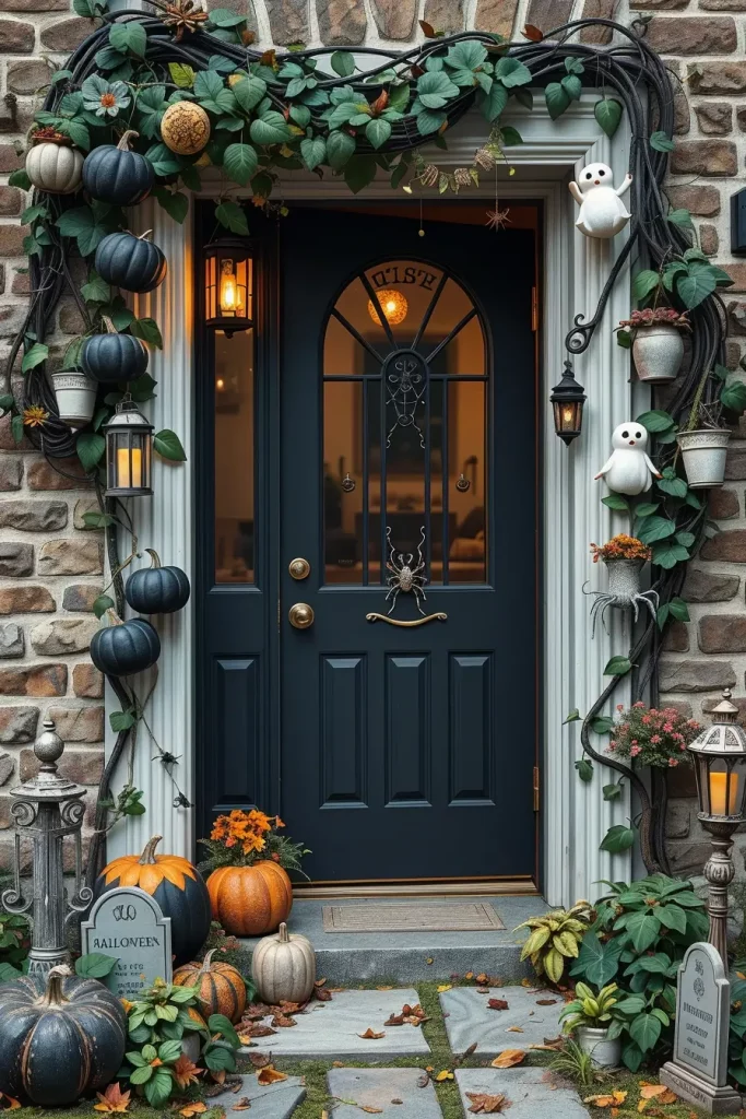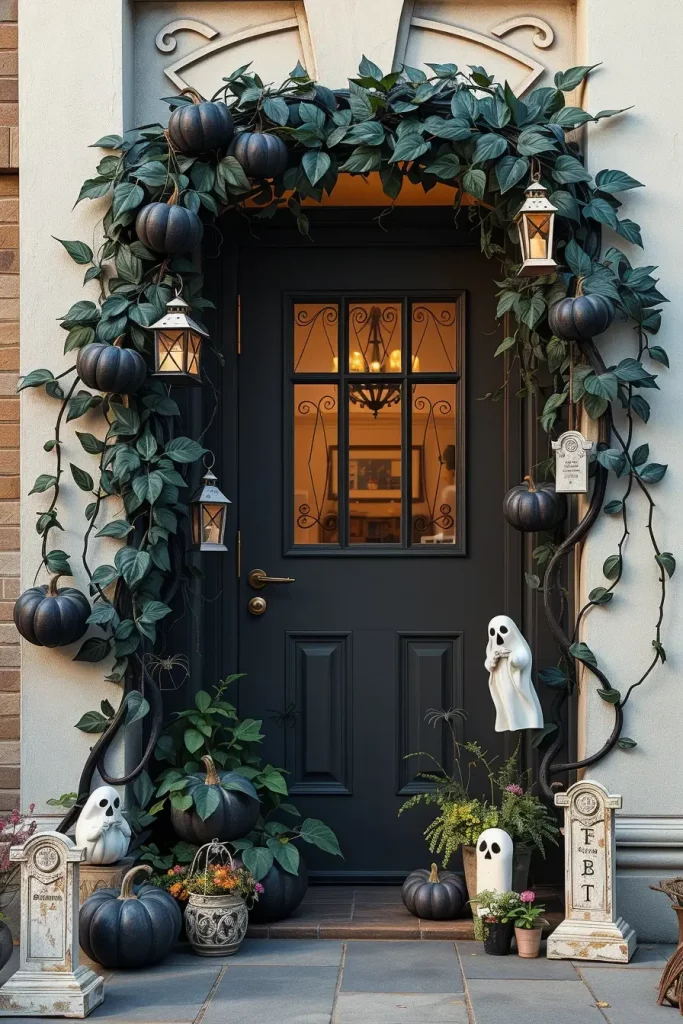 A vertical garden on both sides of a door can be easily transformed into a spooky centerpiece of Halloween. I adore hanging seasonal Halloween decor on modular trellis systems or wall-mounted planter boxes in faux vines or dried black foliage. The outcome is natural and overgrown, which is just creepy enough to be in October.