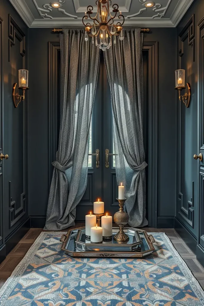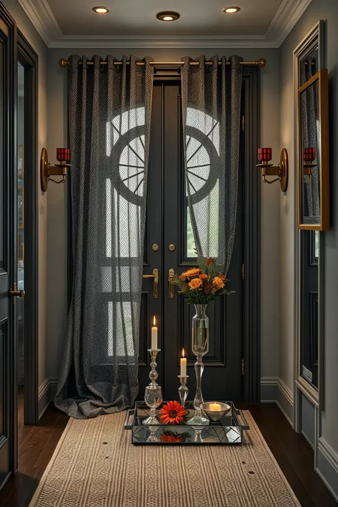 I tend to hang the curtain on a tension rod or hidden track right above the door. The silver chains, polished studs and geometric cut-outs provide the fashion-forward look. On both sides, there are narrow sconces or backlit panels that can be used to enhance the reflective material. I combine the theme with a mirrored tray with crystal candleholders or metallic pumpkins inside.