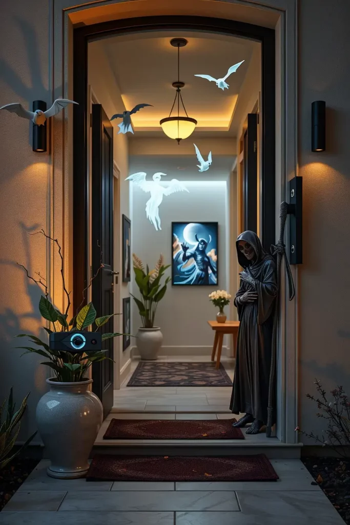 I suggest installing a projector in a contemporary planter or installing it under the roofline. The projection may be motion-activated, timed or looped. It is not overdone by combining it with a clean, minimal doorframe and one creepy prop such as a standing grim reaper or ghost sculpture. In the interior, I keep up the theme of technology by fitting LED strips underneath console tables and framed digital art.