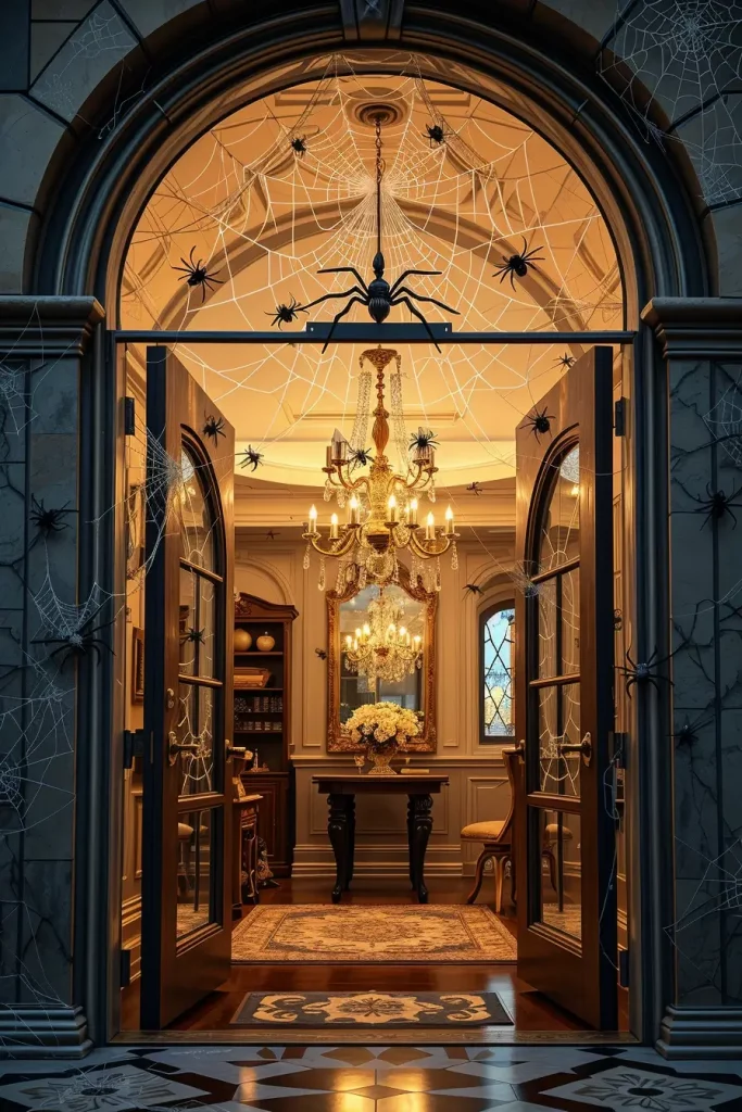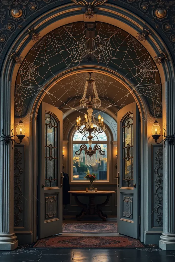 I hang the webs at corners with command hooks and they drop down the frame in asymmetrical designs. The appearance is enhanced with accents such as gold or matte black spiders, crystal webs and pearl-drop dew details. I reflect the idea indoors with a fine chandelier or table runner of the same theme.