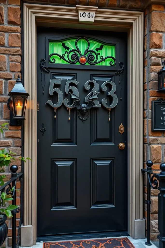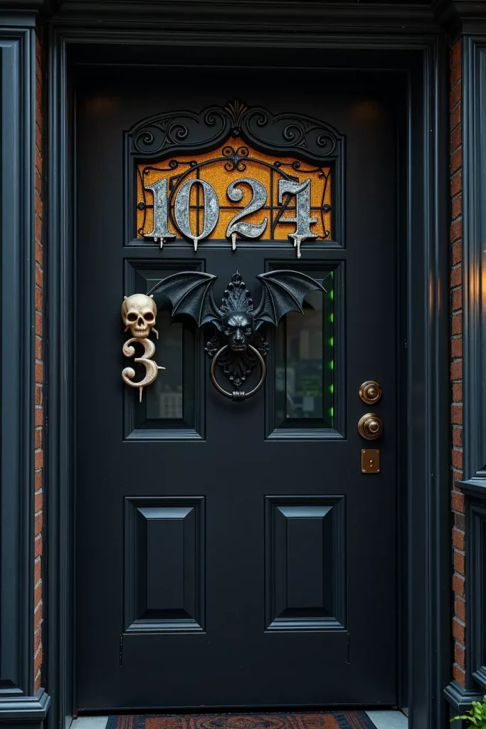 Last October I put in a haunted-type number plaque, with old-style font numbers on a faux-bone background. I combined that with a knocker of bat-wing shape, in matte black. The minimalist can use a temporary vinyl decal that can be dripping with blood or gothic numbers that are easy to install and clean up. I suggest that weather-resistant materials or magnetic backings should be selected to make seasonal changes easy.