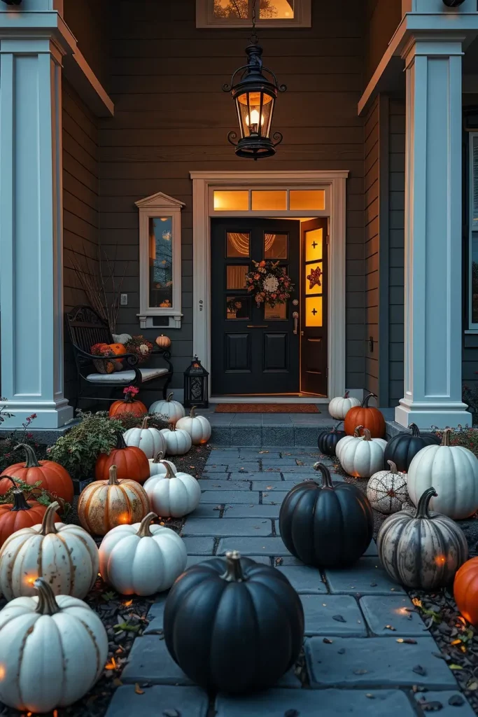 As far as the layout is concerned, I arrange them in asymmetrical rows, leading the eye to the door. At the entrance, I could change to floating orb lights or smart-glow pebbles instead of pumpkins. In the furniture department, I also include a low-profile bench and maybe a side table with stacked pumpkins and a coffee thermos to the trick-or-treat hosts.