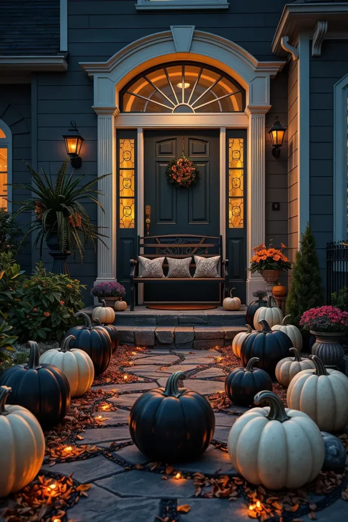 To add a little bit of a stylish twist, go monochrome. This style can be all-black, all-gray, or all-white, but it is all about texture and shape rather than color. I have all-black Halloween doorways with feathered wreaths, matte pumpkins, and fluffy doormats all chic and scary in the best sense.