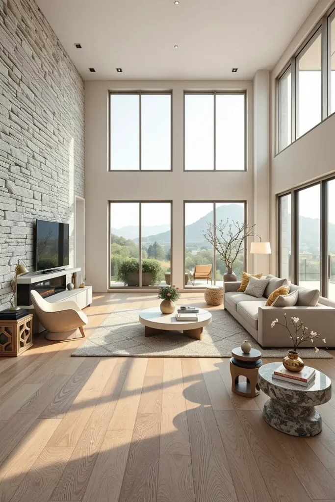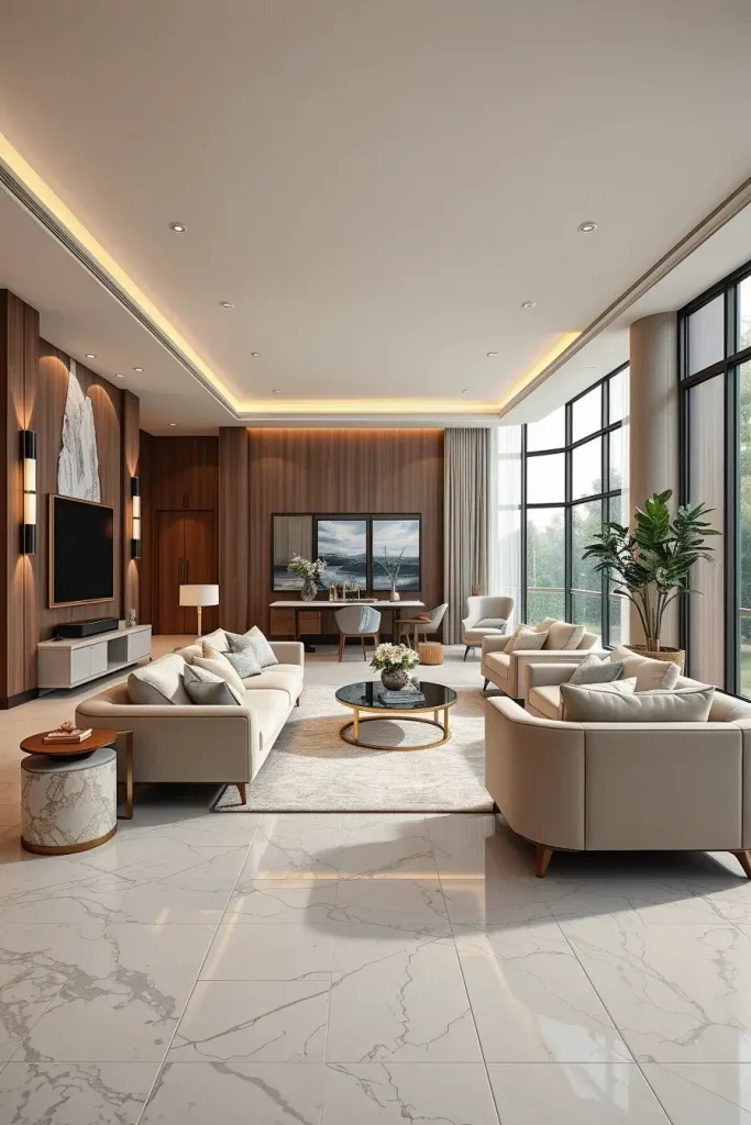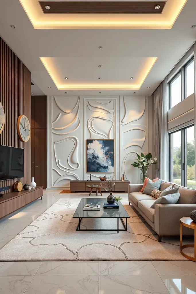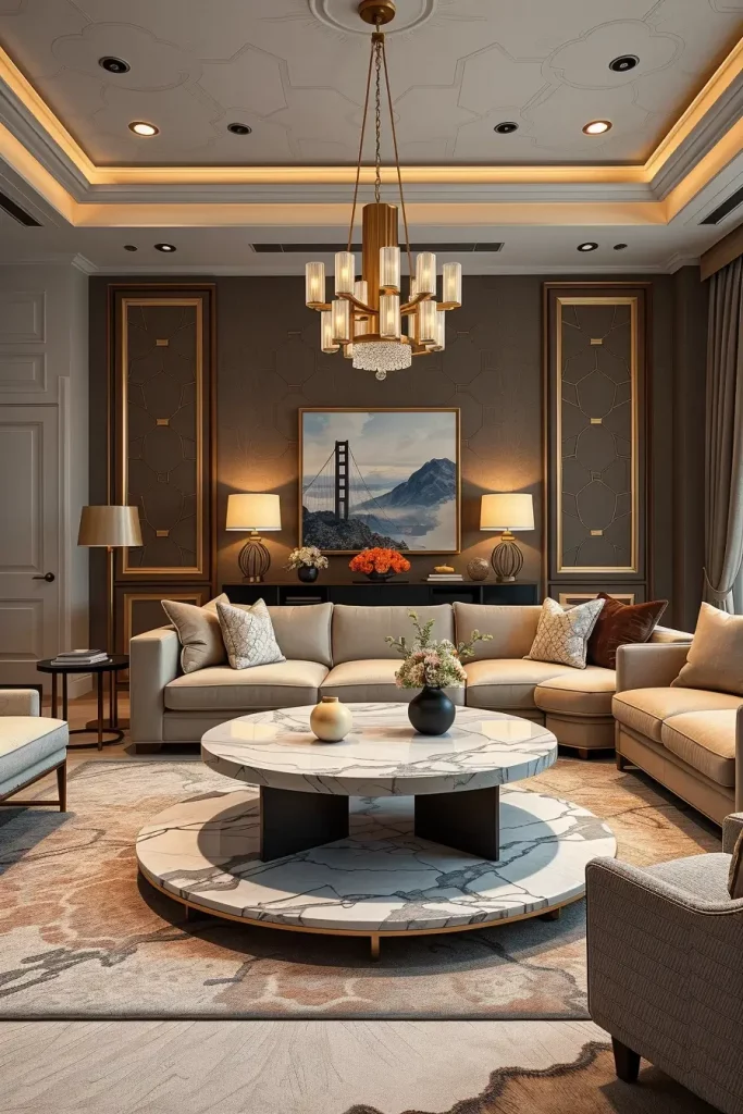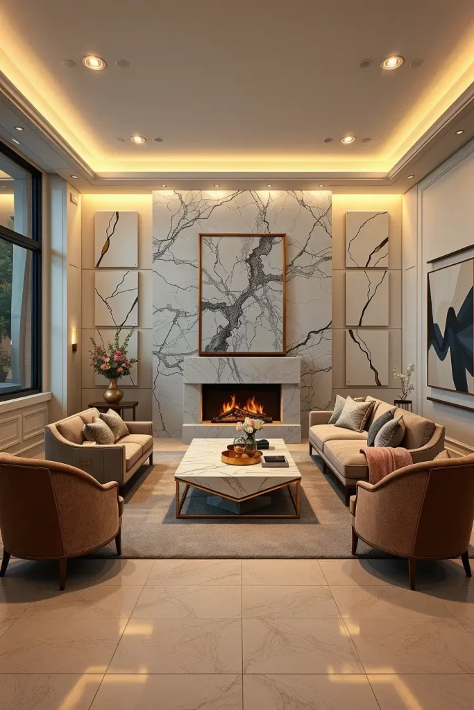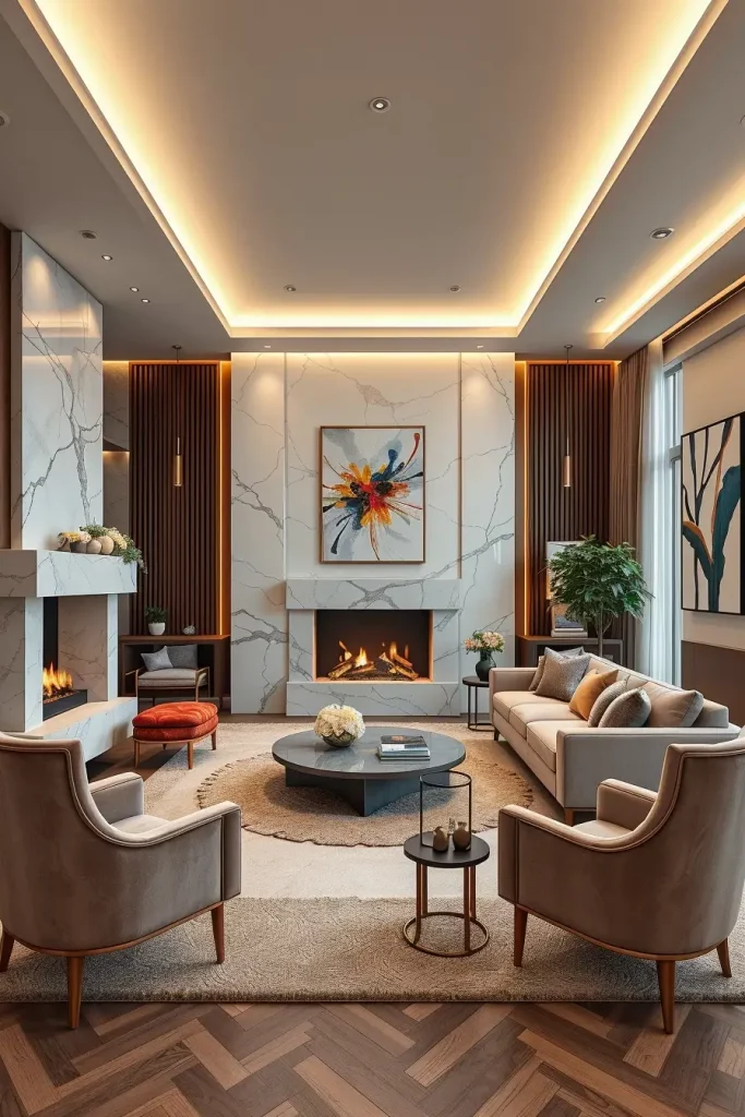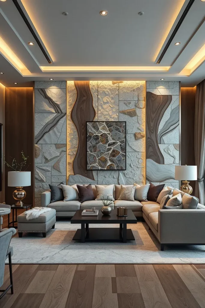 In the cases when I am planning to create the instant impression in a luxury living room, I construct an impressive wall in stone or wood inlays. These organic materials add both the art and permanence to the space. I will always prefer marble, travertine or walnut panels in geometric or linear designs that will also serve as points of visual focus.