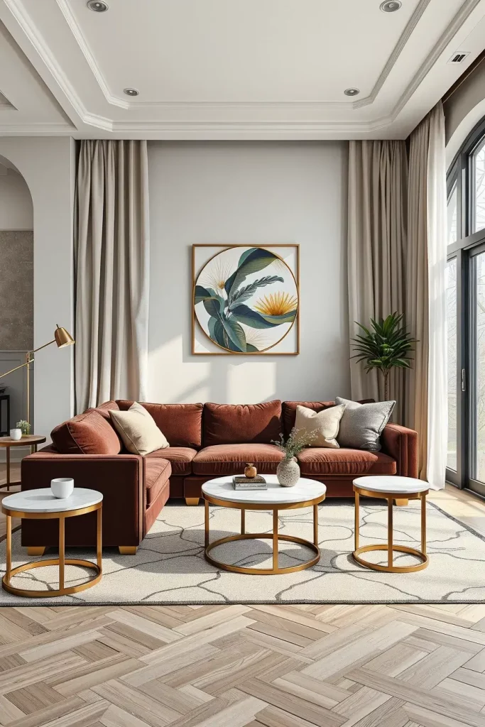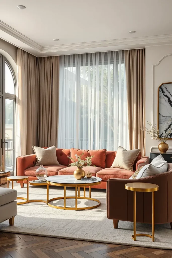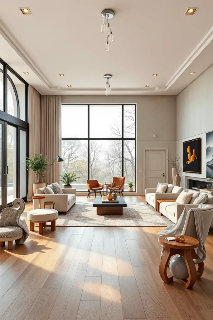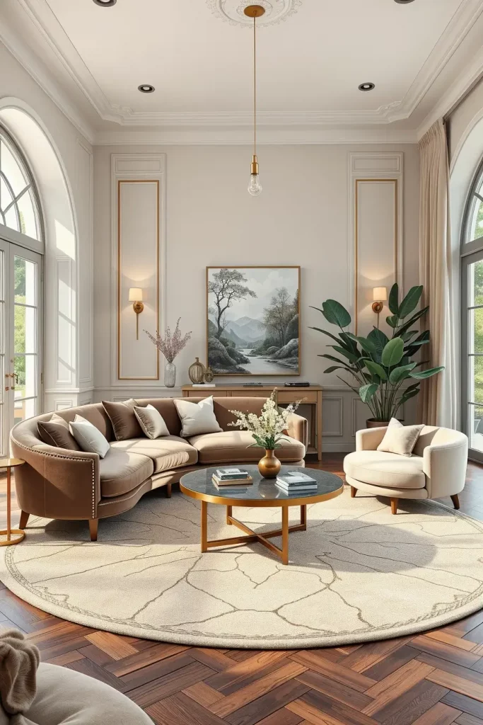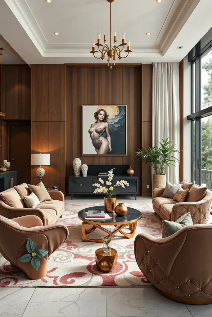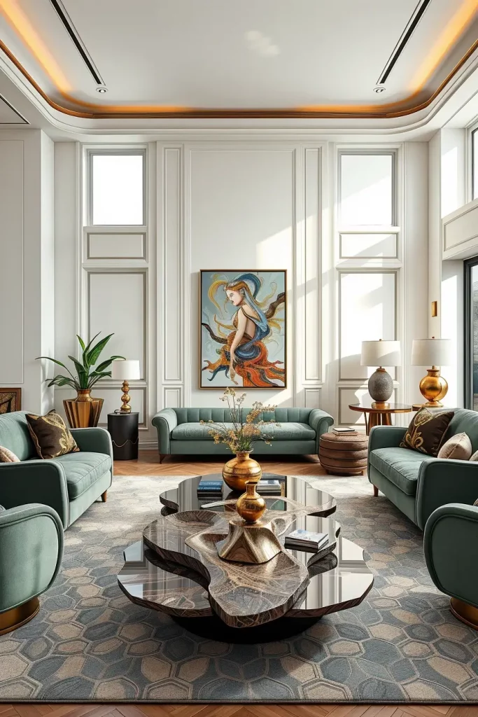 I would choose such materials as lacquered wood, brushed metal, and stone composite that are characterized by the modern grace. Every object, be it a side table with a curved shape, or a chair with sweeping lines, brings rhythm in the room. These artistic forms are balanced with some more more gentle textures such as velvet upholstery making the whole design story higher.
