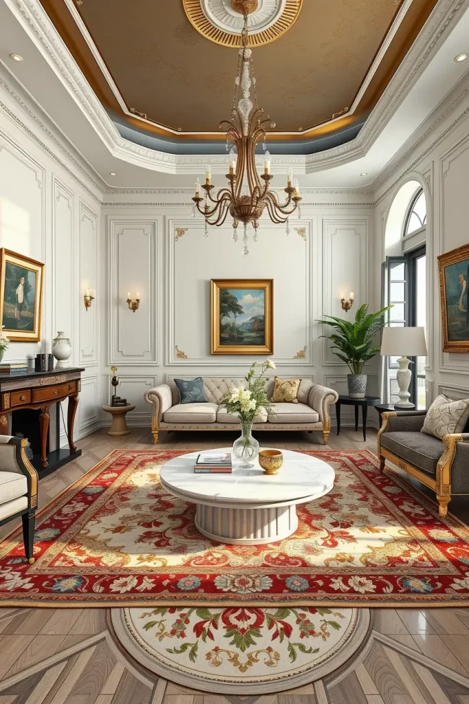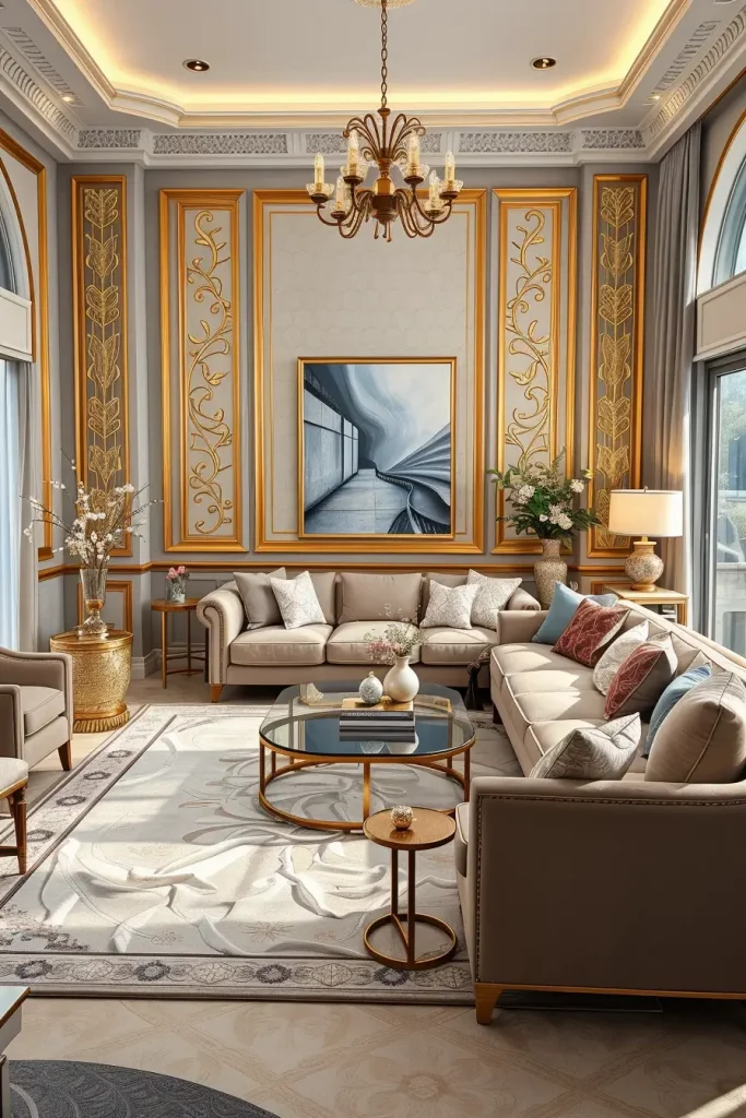 In order to accomplish such a configuration, I would add floor lamps with sculptural bases or hidden LED strips at the back of panels to make them look like a soft backlight. These little extensions complete the luxurious appearance of the room and make the traditional forms of design layouts more contemporary.