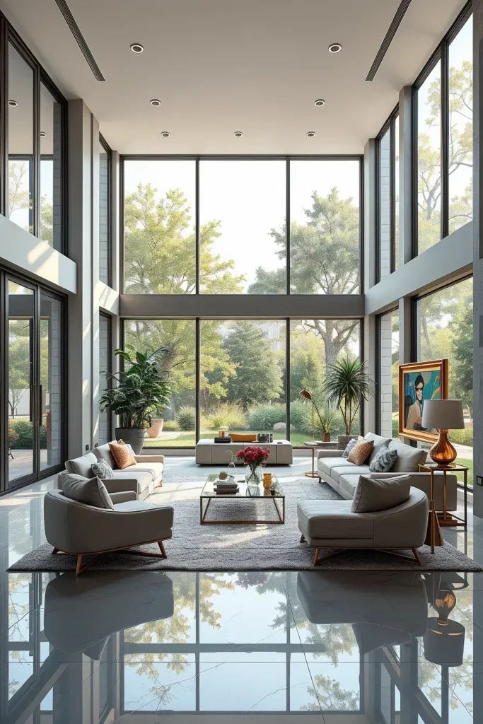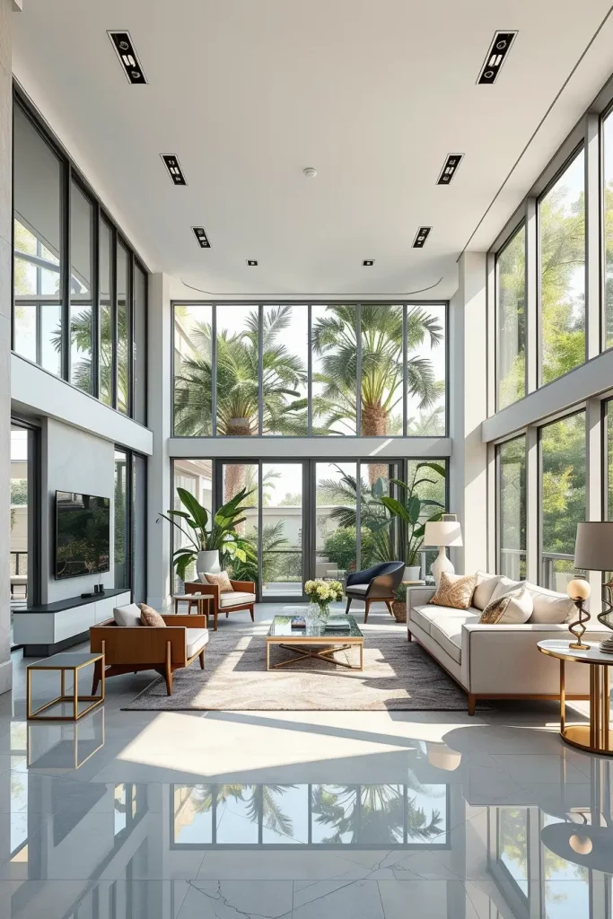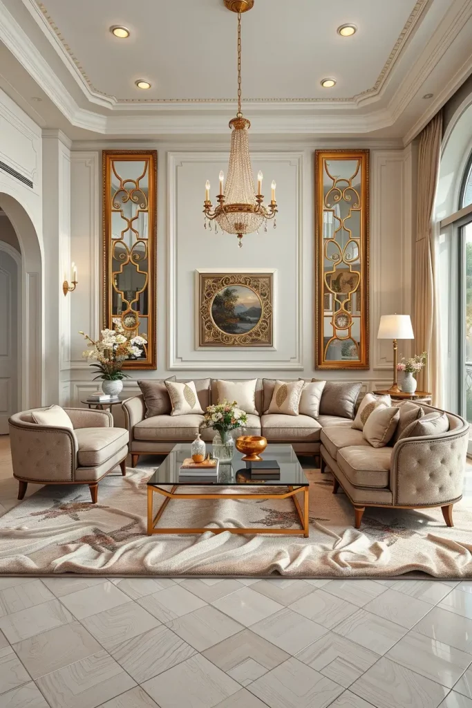 Mirrors are used to create spacious and brightly lit luxury living rooms. I am fond of glass and mirror surfaces that are applied to enhance natural light and give the illusion of space. These pieces are a touch of contemporary and beauty, whether in the form of mirrored consoles, glass-top coffee tables.