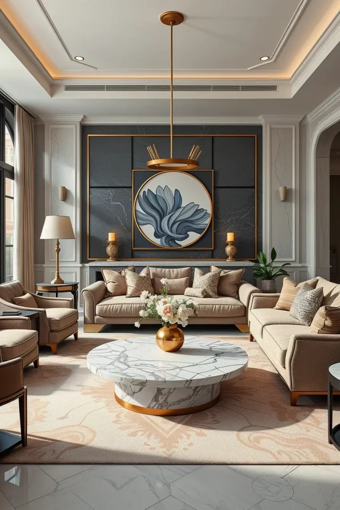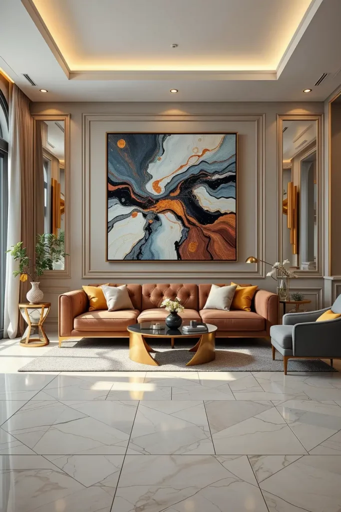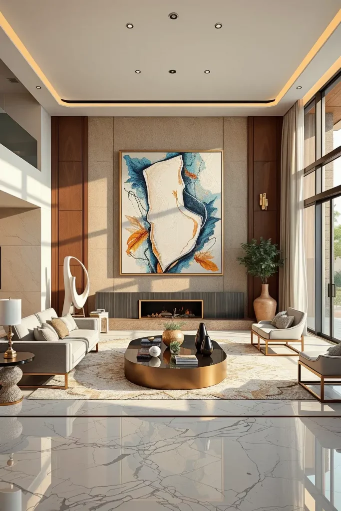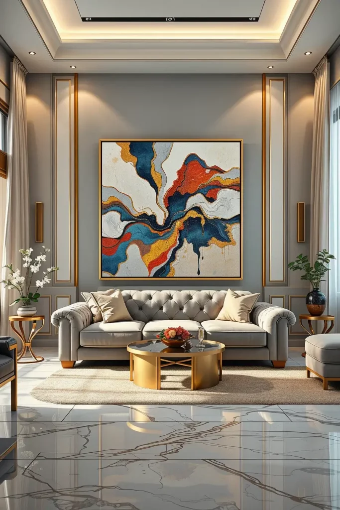 I usually opt to have one large item above the fire or the sofa, and will adjust the ratio of the smooth modern furniture, as well as the minor ones. Artwork in neutral or metallic colors complements marble floors, velvet fabrics, and gold decorations and creates a high-end balance between simplicity and abundance. All the textures in the room, such as the silk drapes or polished coffee table, act as an enhancement of the presence of the art.