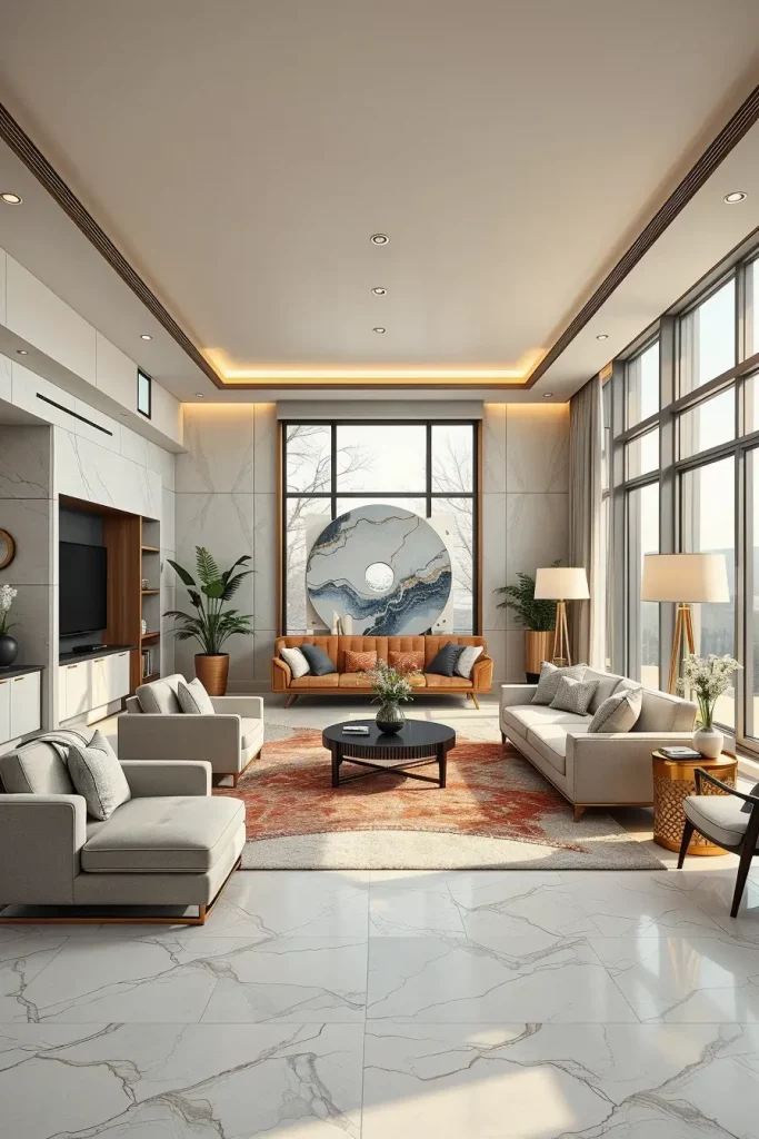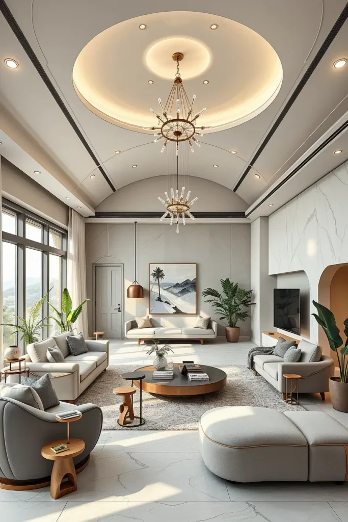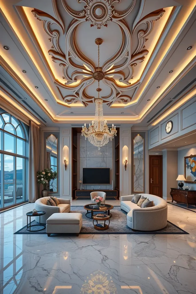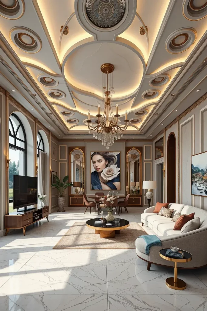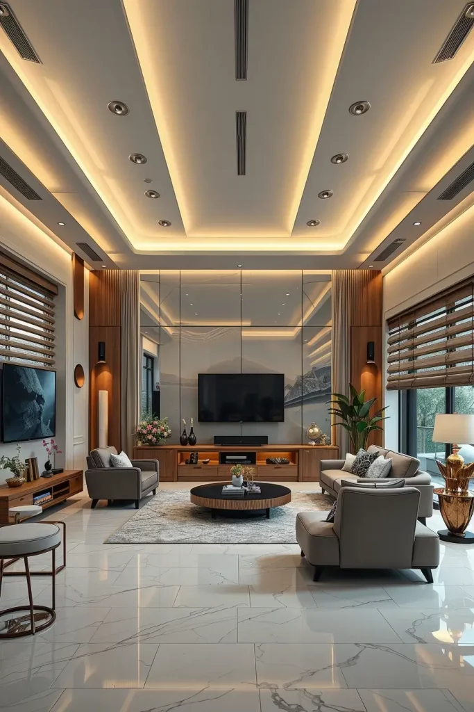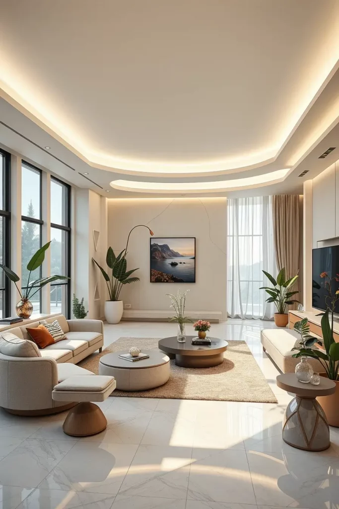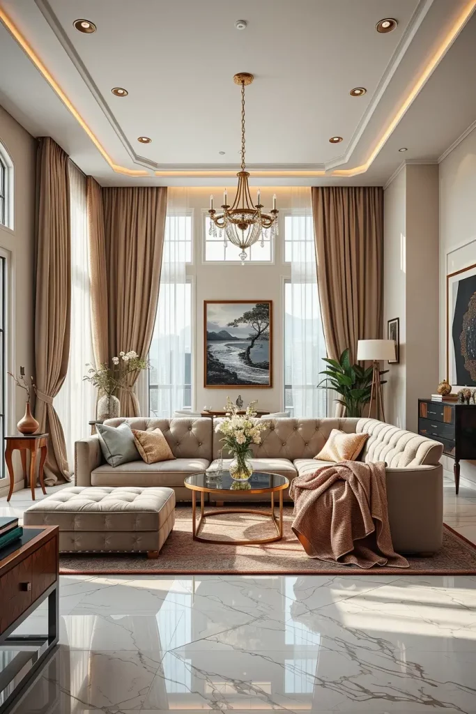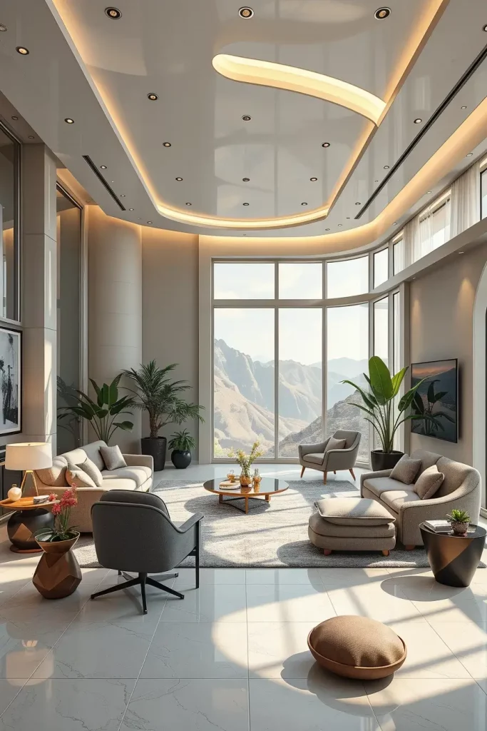 The ceiling which was a neglected surface has been turned into a creative surface. My focus in the luxury living rooms 2026 will be on artistic ceilings with LED perimeter lighting to provide depth and a visual drama. The predominant use of soft lighting creates an upwards focus and the whole room appears to be larger and heavier building.